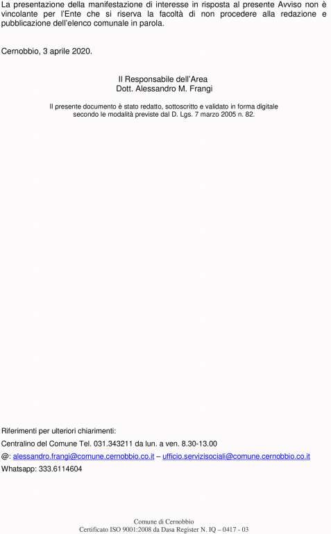 Per dubbi o chiarimenti è possibile inviare una e-mail a ufficio.servizisociali@comune.cernobbio.co.it o contattare il numero 031-343211 dal lunedì al venerdì dalle 8.30 alle 13.00