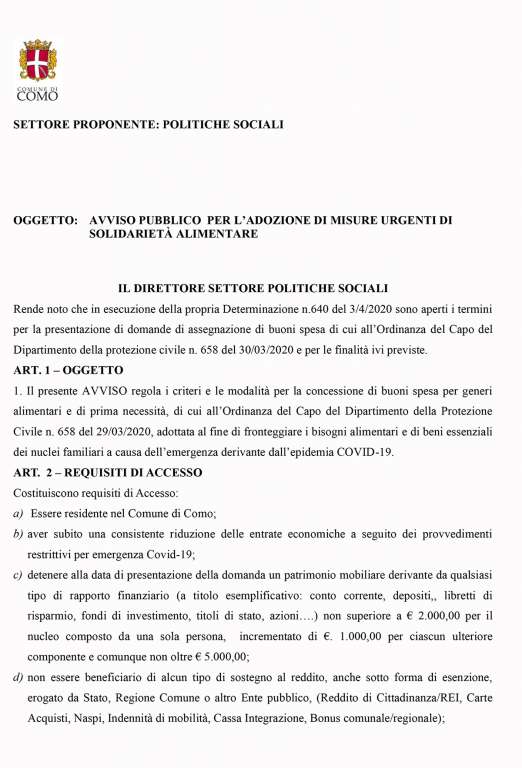 La Giunta del Comune di Como oggi pomeriggio ha deliberato in merito alle modalità di erogazione delle risorse per fronteggiare l’emergenza alimentare di cui all’ordinanza della Protezione Civile n. 658 del 30 marzo 2020.