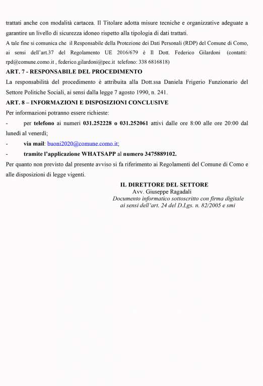 Per chi non è dotato di strumenti informatici, il Comune consente di presentare la domanda contattando i Servizi Sociali ai seguenti numeri: 031.252228 o 031.252061 dal lunedì al venerdì dalle ore 8.00 alle ore 20.00.