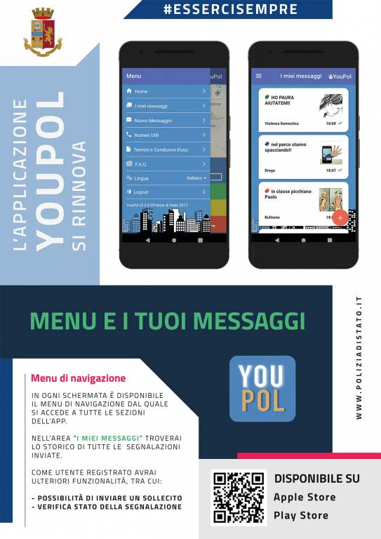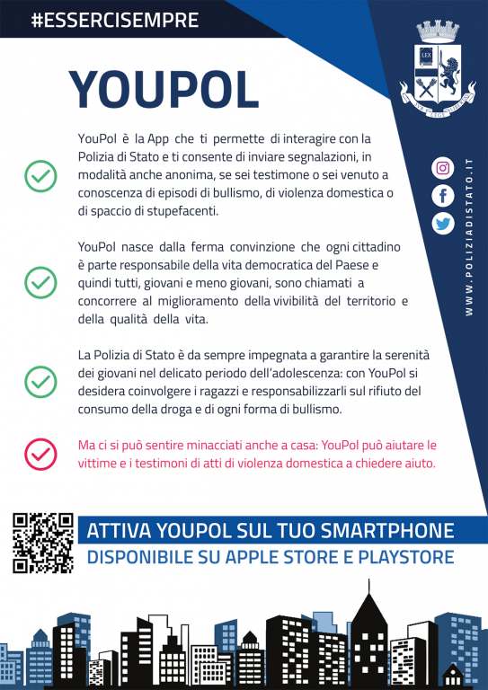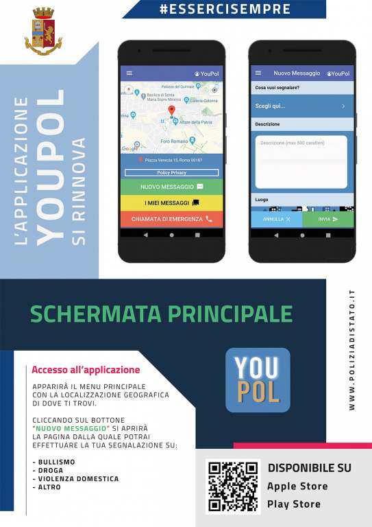 Ideata per contrastare bullismo e spaccio di sostanze stupefacenti nelle scuole, l’app è caratterizzata dalla possibilità di trasmettere in tempo reale messaggi ed immagini agli operatori della Polizia di Stato.