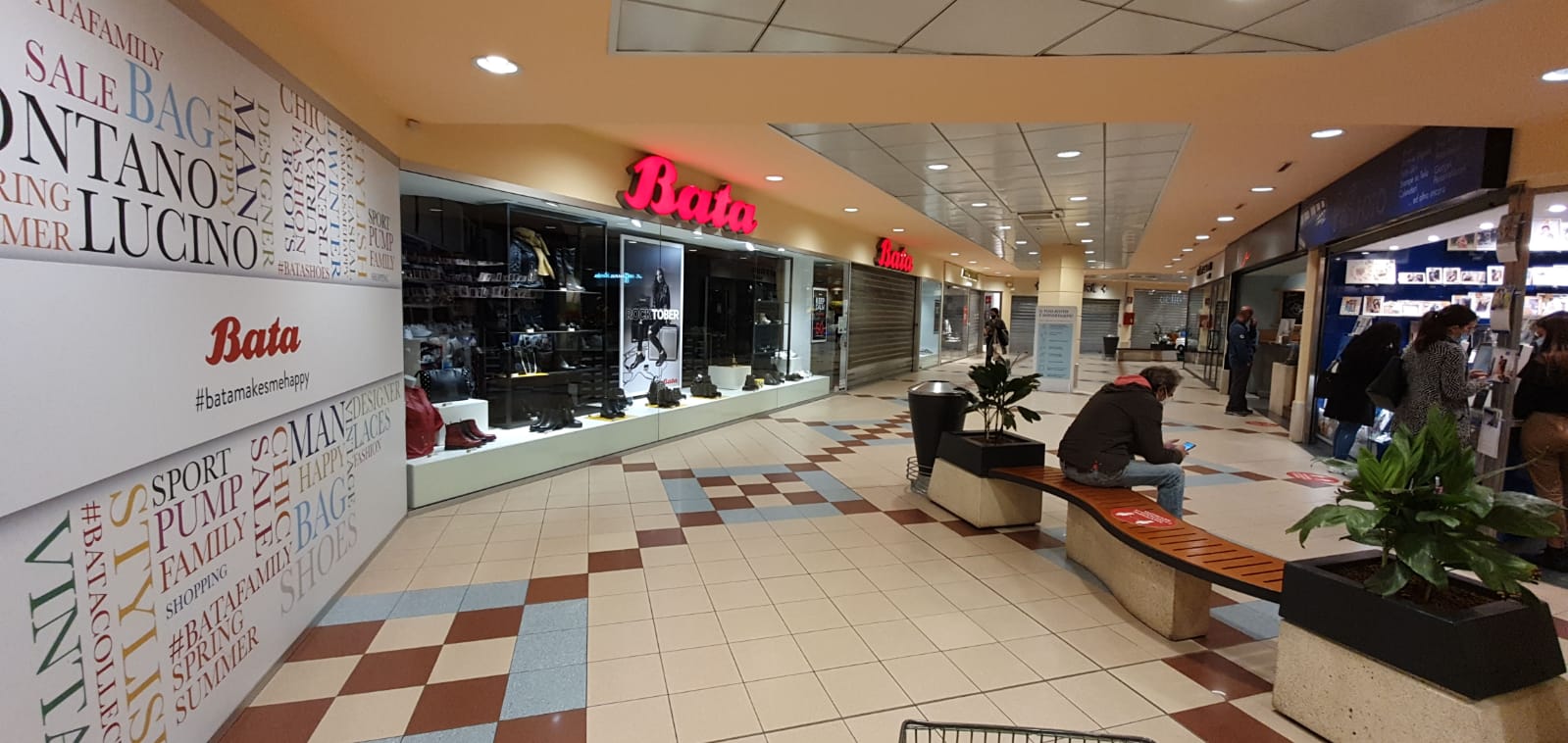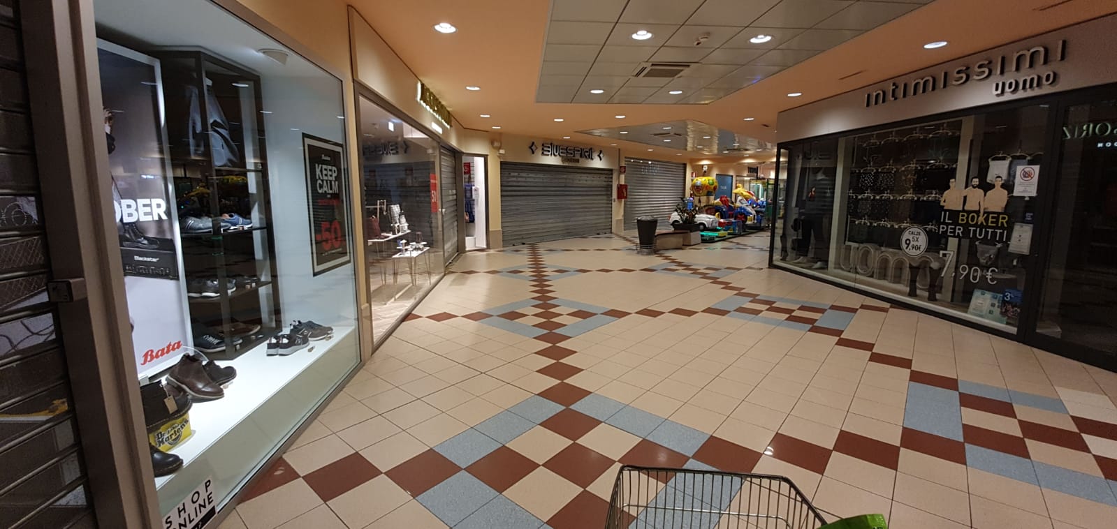 Le gallerie con i negozi hanno serrande abbassate, luci spente e corridoi deserti.