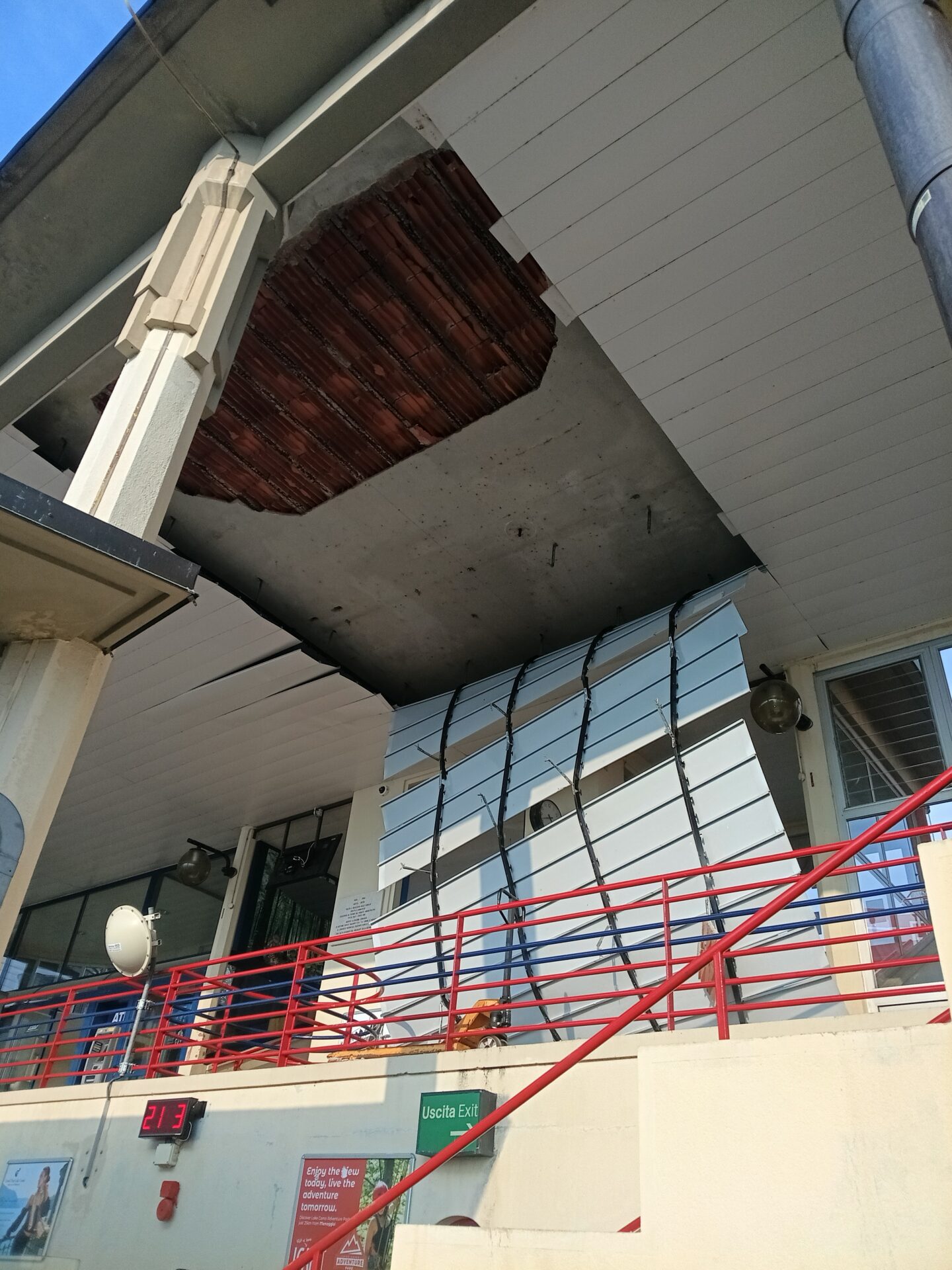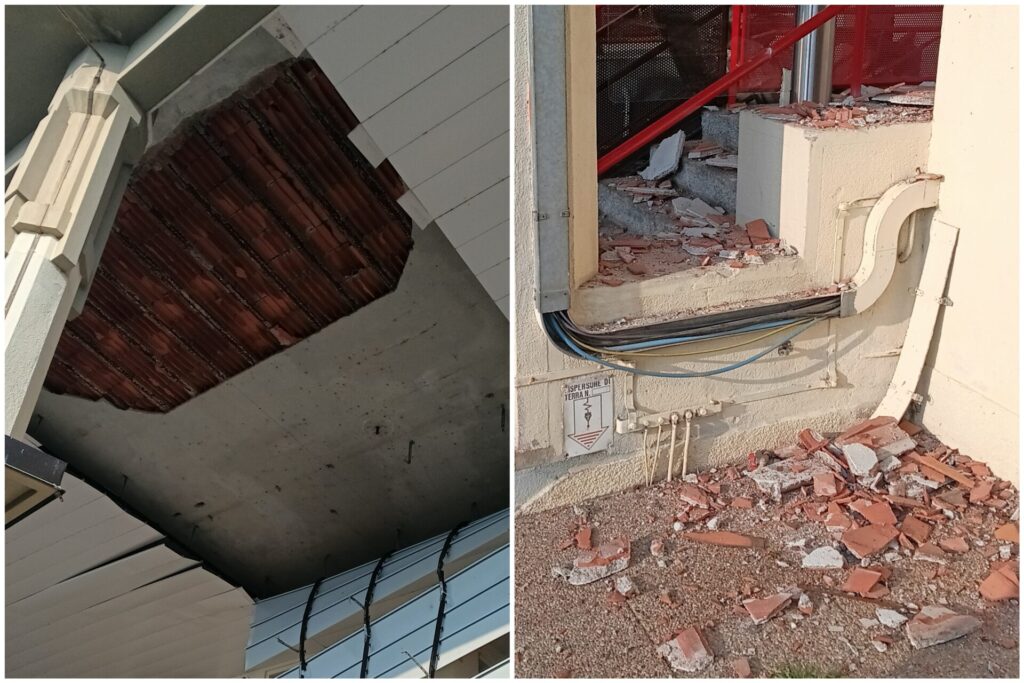 Una vasta porzione della tettoia ha ceduto, travolgendo anche il controsoffitto appena sottostante. Calcinacci e pannelli sono dunque caduti rovinosamente al suolo.