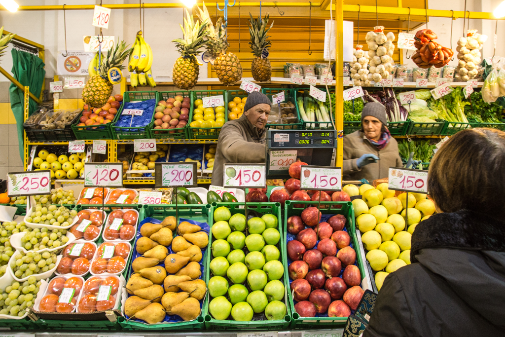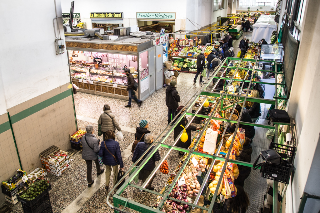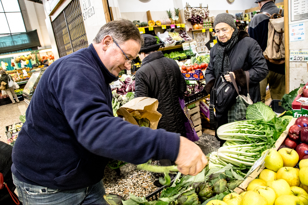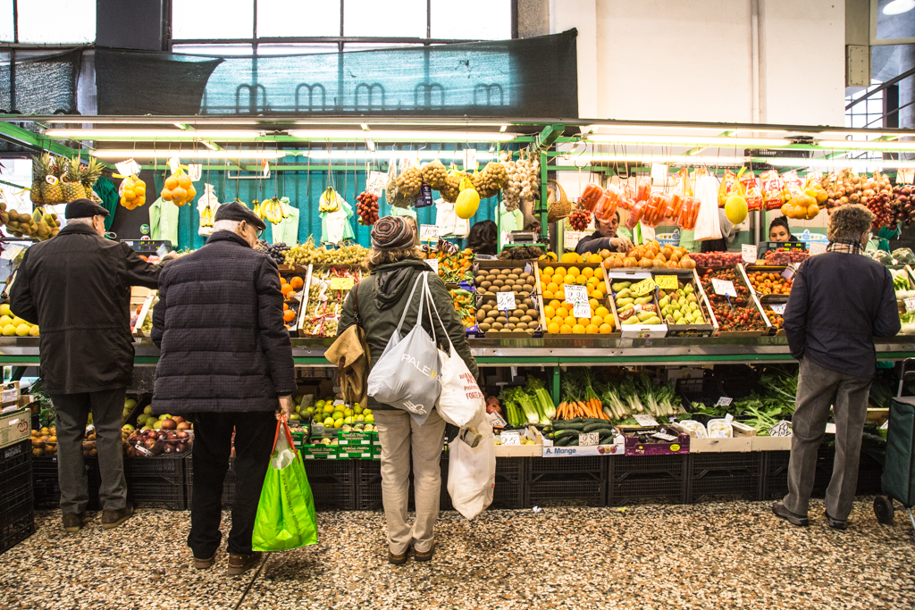 Andare al mercato in una giornata infrasettimanale è un gesto di un’altra epoca, quasi rivoluzionario. La folla di pensionati che incede lentamente tra i banchi, il crepitio di sacchetti di carta marrone che si chiude attorno a frutta e verdura, i consigli per gli acquisti che i venditori riservano ai clienti più fedeli; gesti antichi che ostinatamente sopravvivono, mentre altrove clienti con molta fretta e poco tempo per le chiacchiere scivolano oltre l’orizzonte degli eventi della grande distribuzione.