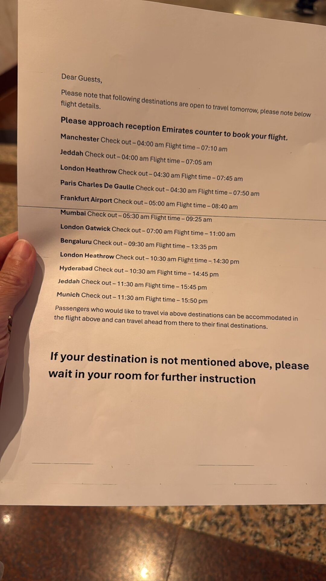 Come detto, si tratta di voli specifici messi in campo apposta per l’emergenza: “Anche perché l’aeroporto di Dubai, almeno fino a che noi eravamo lì, era ancora chiuso e i voli normali venivano costantemente cancellati. Il consiglio che mi sento di dare io, dunque, almeno secondo l’esperienza diretta, è di provare prima di tutto ad affidarsi a questo canale speciale messo a disposizione di chi deve rientrare da parte di Emirates. L’acquisto di biglietti ordinari, senza un canale specifico e puntando su voli tradizionali, è molto più rischioso. Noi stessi abbiamo visto alcune persone che hanno provato e poi si sono visti cancellare tutto. Alla reception dell’hotel di Emirates, invece, c’è un desk specifico che si occupa di chi deve rientrare e può trovare posti sui voli dedicati con più facilità. Inoltre, la compagnia si è fatta carico di tutti i costi, non abbiamo dovuto pagare nulla”.