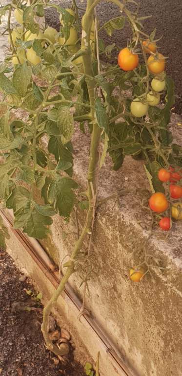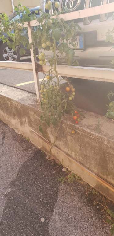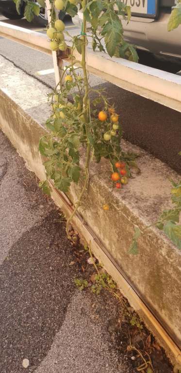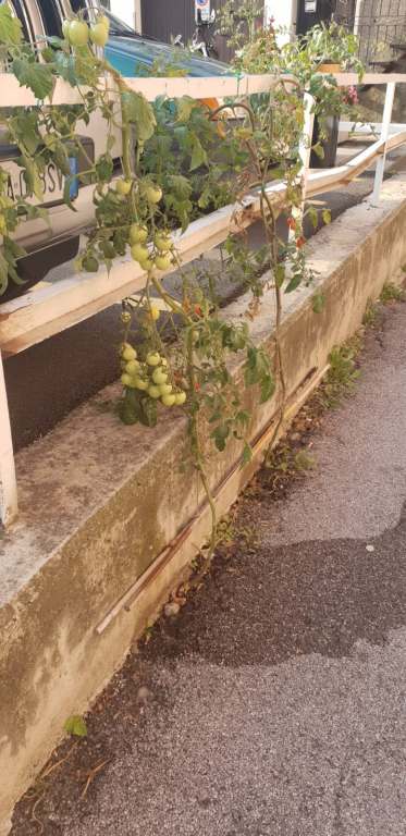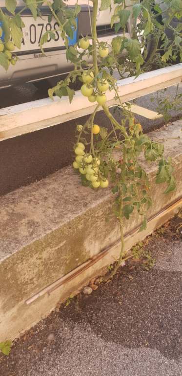 Le foto lascerebbero intendere si tratti di pomodorini ciliegini, buoni per il sugo di una pastaciutta, volendo. I rami sono carichi di piccoli frutti che dal verde stanno per virare verso il rosso sulla via della maturazione.
