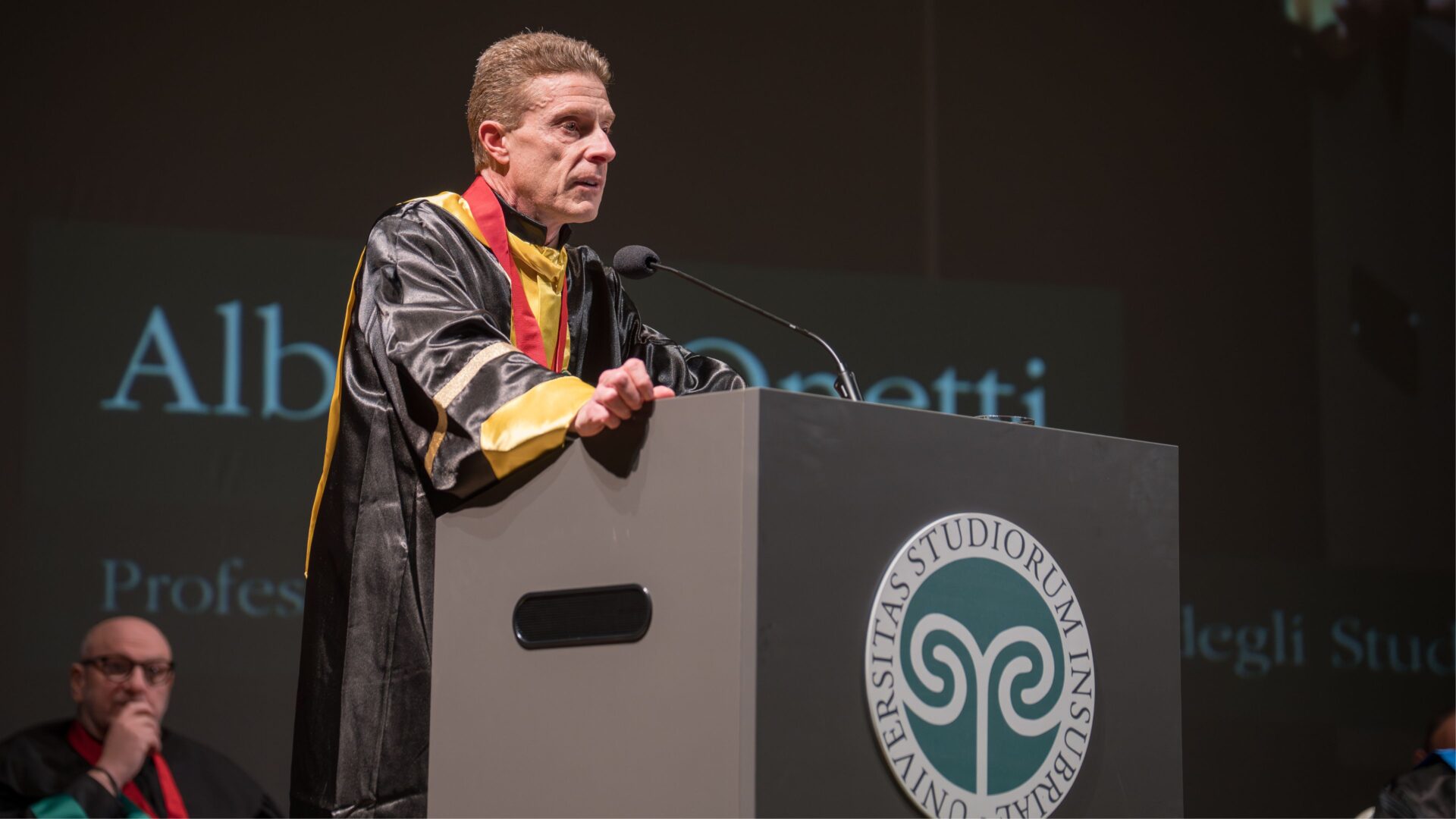 È seguita la lectio magistralis di Andrea Carcano, intitolata «Da Zero a Uno: Insubria-Silicon Valley e ritorno», nella quale ha ripercorso il proprio percorso accademico e imprenditoriale, dal dottorato all’Insubria alla crescita internazionale dell’azienda, soffermandosi sul rapporto tra ricerca, impresa e innovazione.