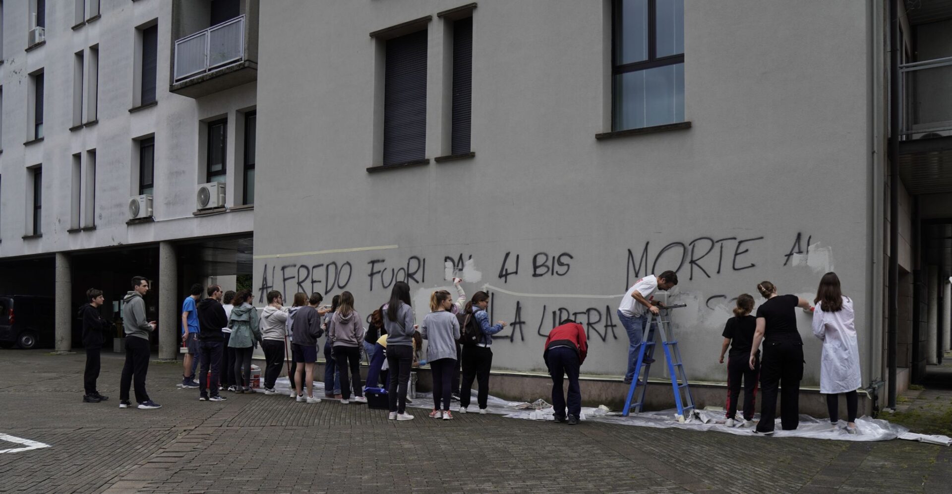 I carabinieri hanno chiesto di non cancellare alcune scritte, quelle realizzate tra la notte di giovedì e venerdì, poiché sono ancora in corso le indagini. “Siamo molto soddisfatti di questo intervento – dice Simone Pelucchi, presidente de Lo Snodo – La partecipazione dei ragazzi è stata molto alta: siamo arrivati a 40 volontari. Quasi 100 persone sono venute invece a sostenerci, portando la loro solidarietà per la minaccia ricevuta nei giorni scorsi. Ringraziamo Patrizia Crespi, professionista che ci ha supportato nel lavoro”.