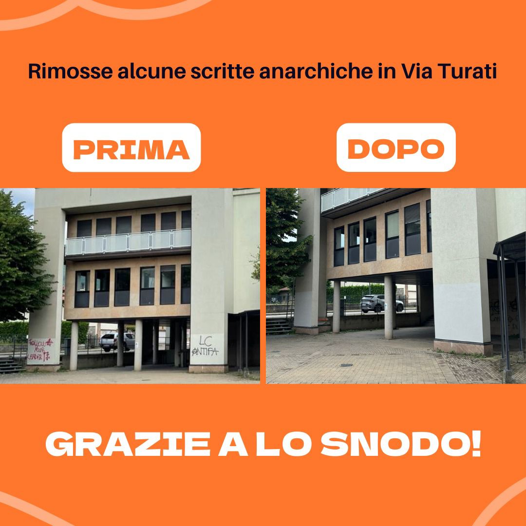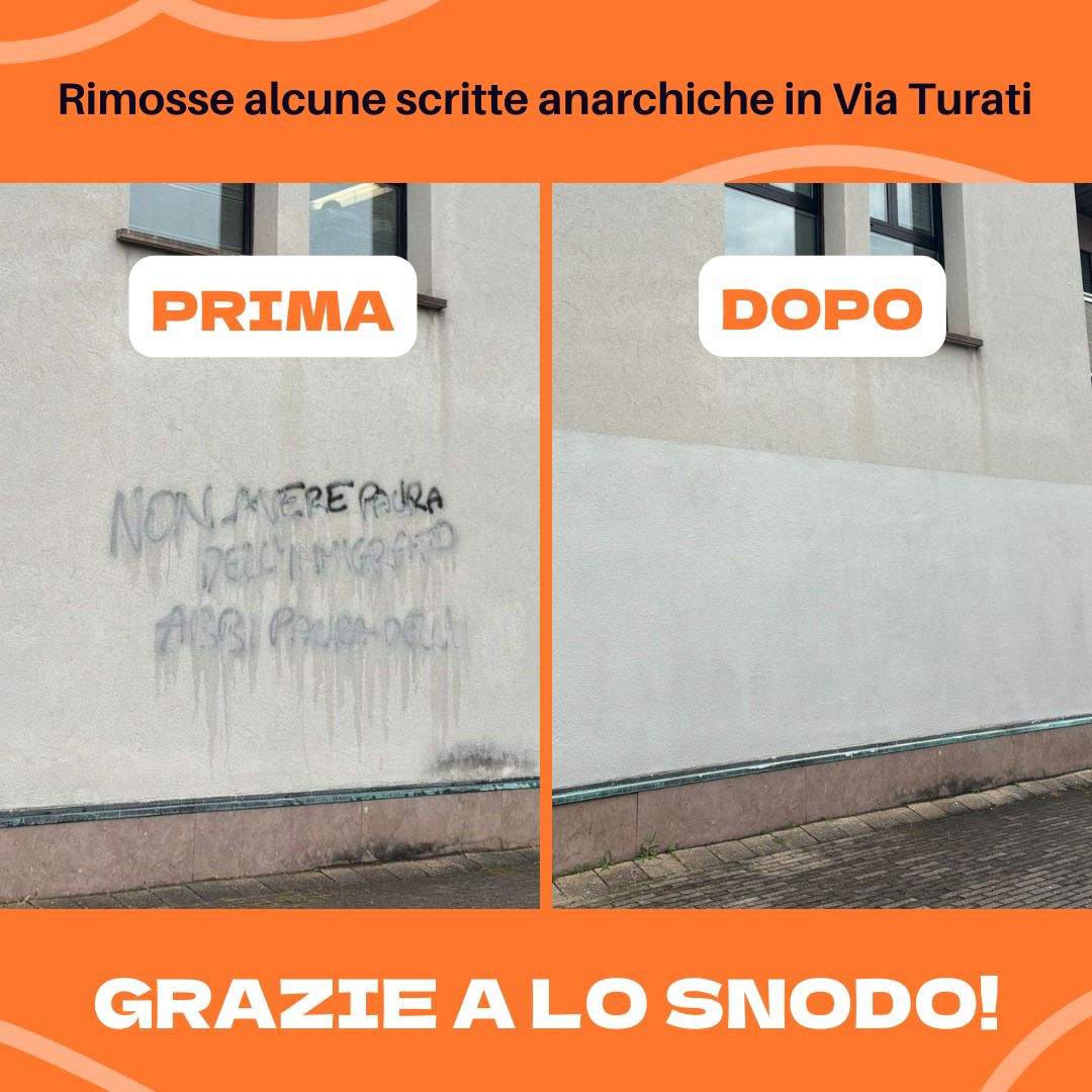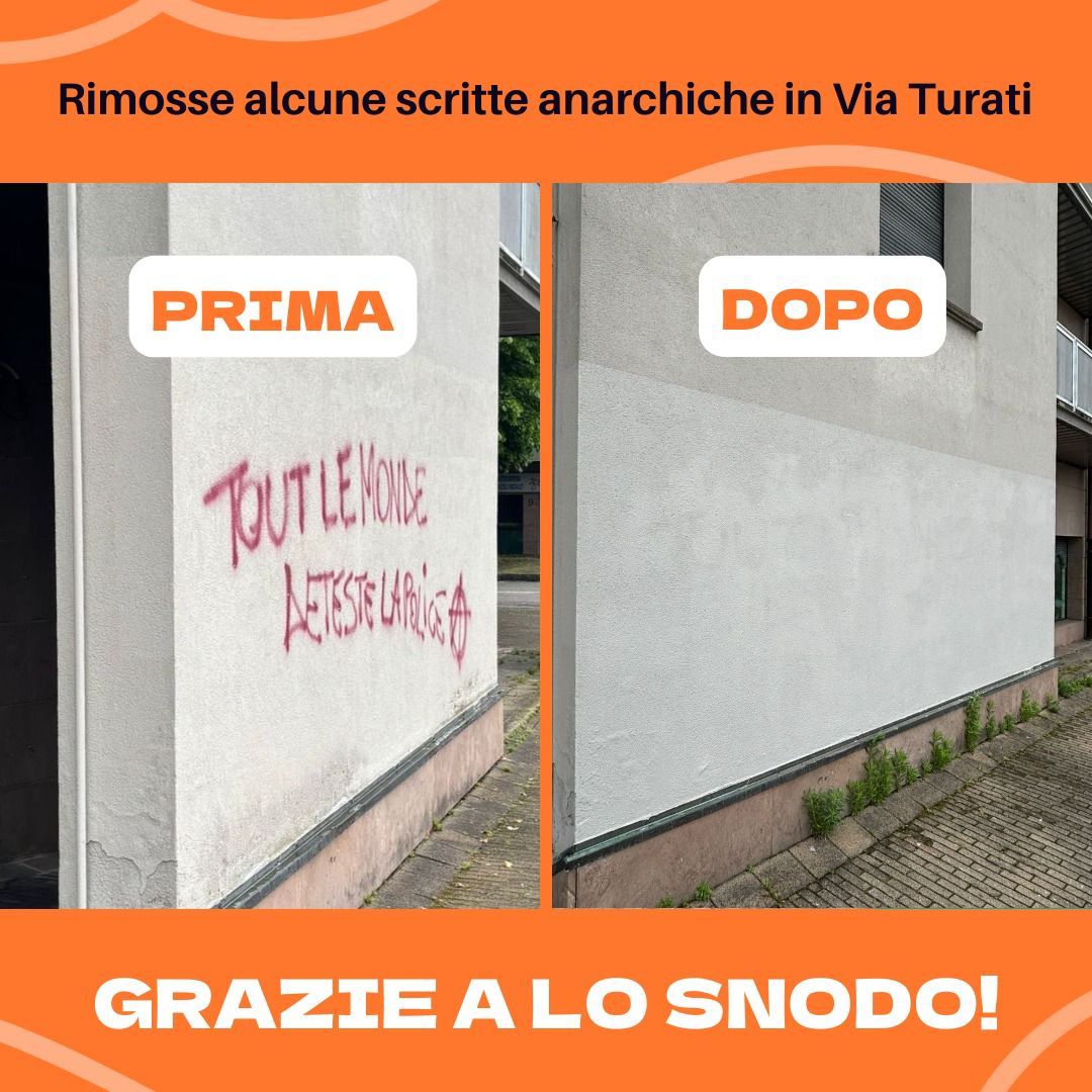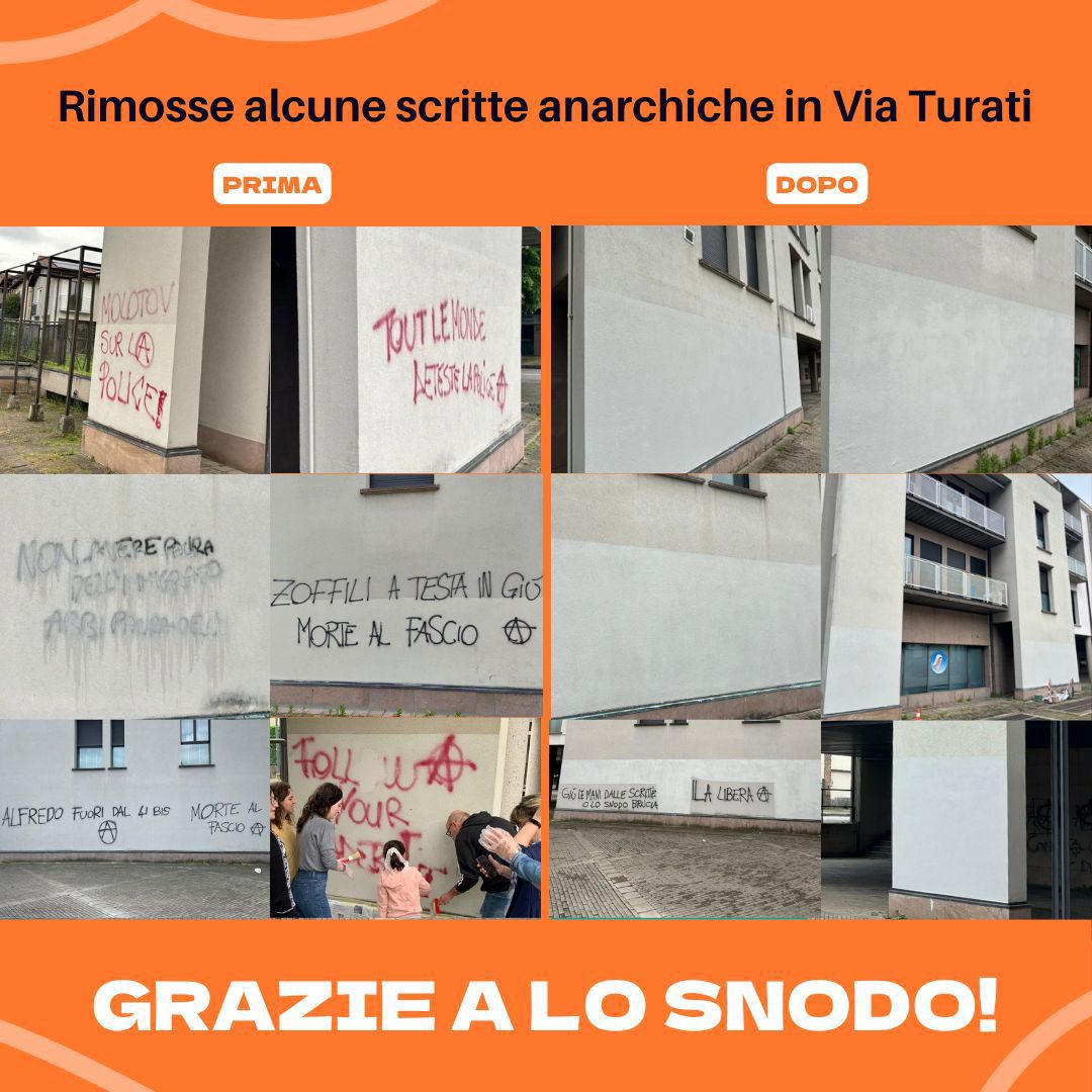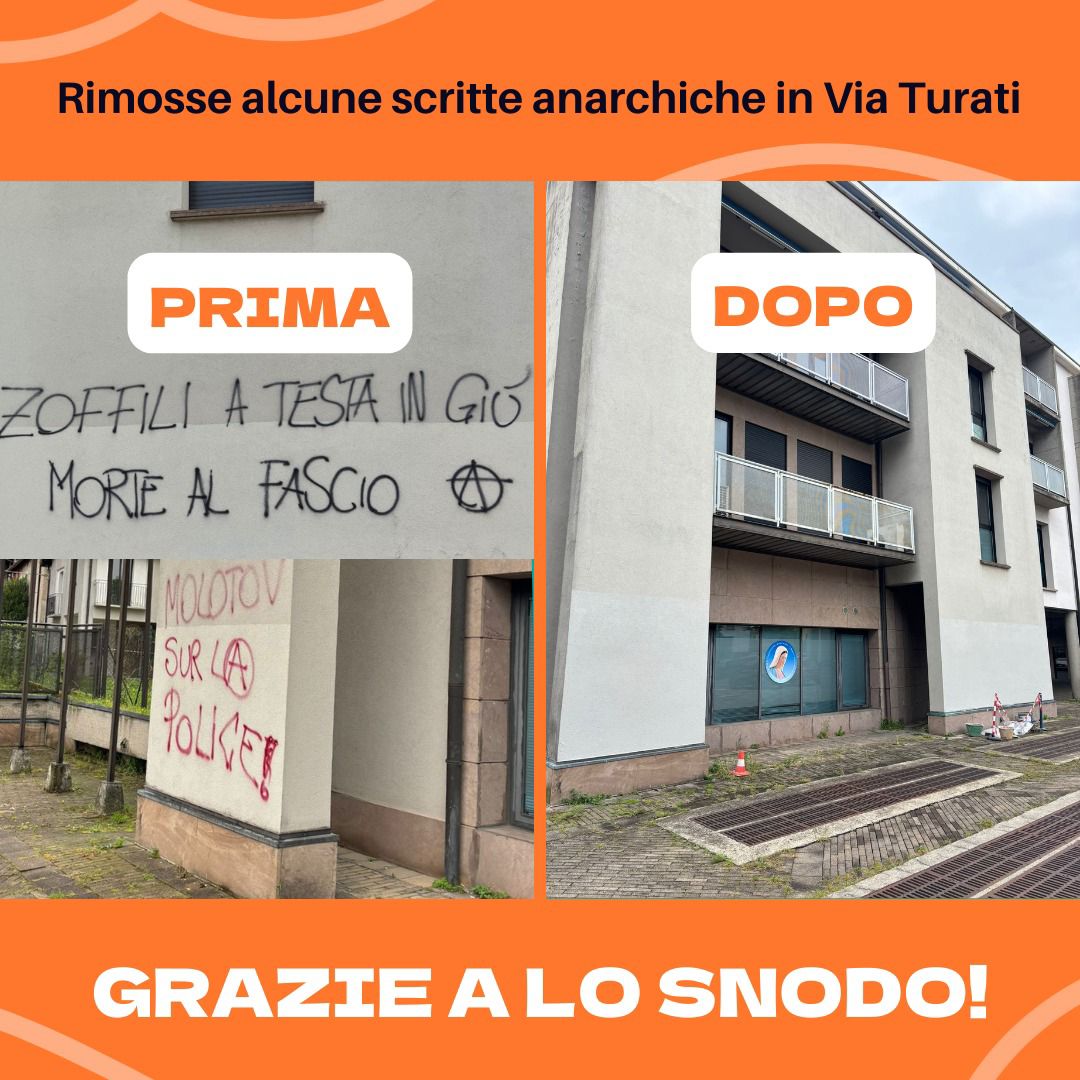 “Lo Snodo non si ferma”: è questo lo slogan che ha accompagnato le ore precedenti alla pulizia delle scritte anarchiche presenti in Via Turati. L’Associazione, infatti, nonostante le minacce ricevute nei giorni precedenti (qui le cronache), ha scelto di effettuare comunque l’intervento di riqualificazione che è stata sostenuto economicamente da Lo Snodo.