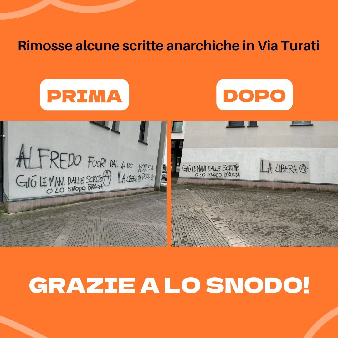 Nella giornata di sabato 15 maggio i ragazzi de Lo Snodo, armati di rulli e pennelli e sostenuti da oltre 100 persone che hanno portato la loro solidarietà, hanno effettuato la pulizia di alcune scritte anarchiche presenti in Via Turati da oltre un anno.