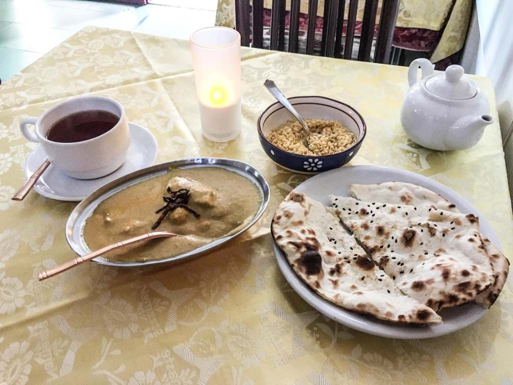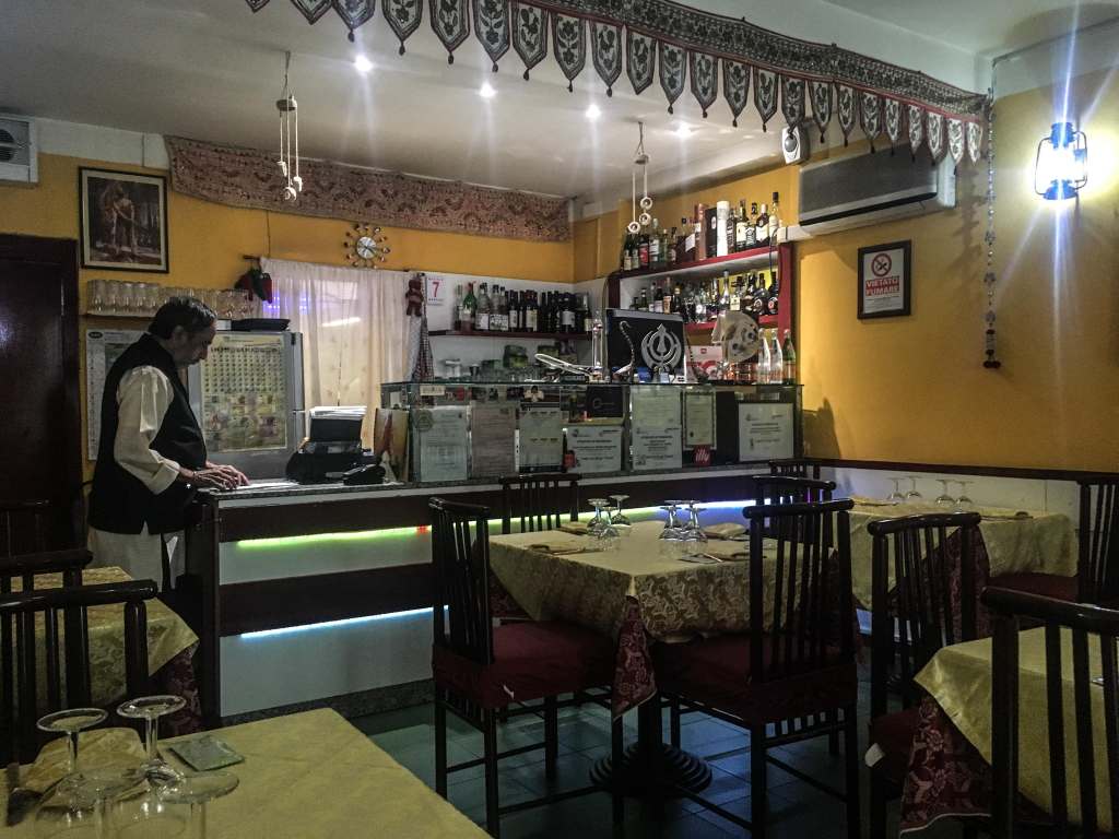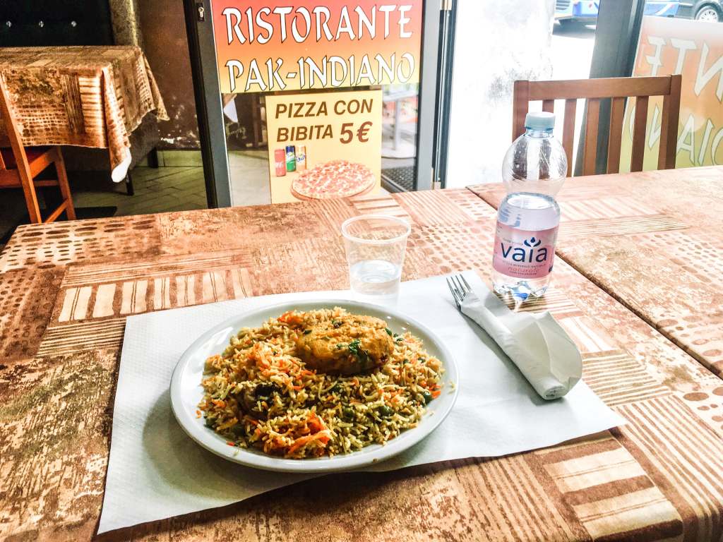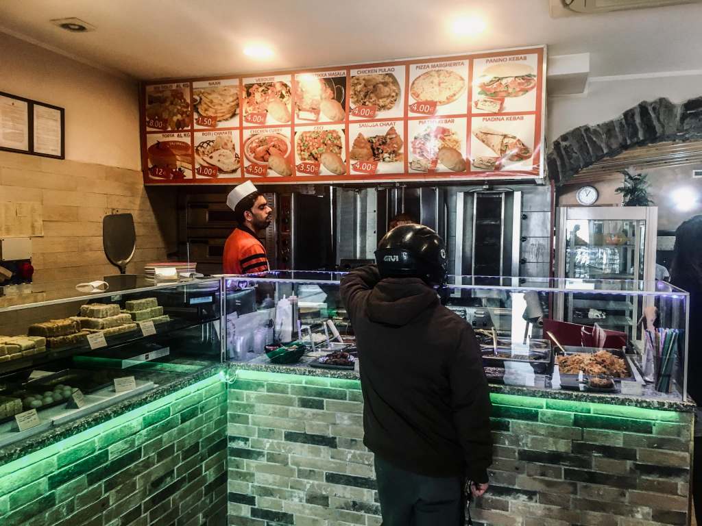 Un locale dal nome iconico – Taj Mahal – sembra promettente per pranzo. Alcuni italiani provano a ordinare piatti dal nome dimenticato, mimando il contenuto, aiutati dai due camerieri. Ordiniamo un Biryani – riso alle spezie e coscette di pollo – e una Aloo Tikki – una polpetta piccante di patate e piselli. Al cibo poco importa dei confini.