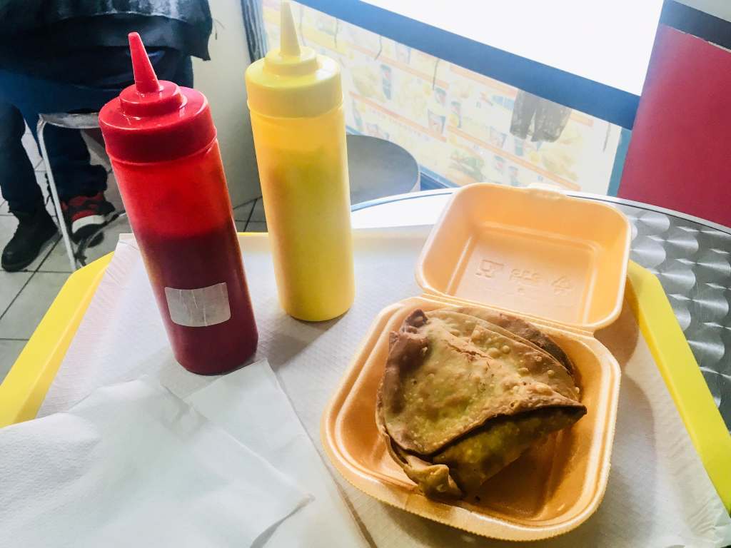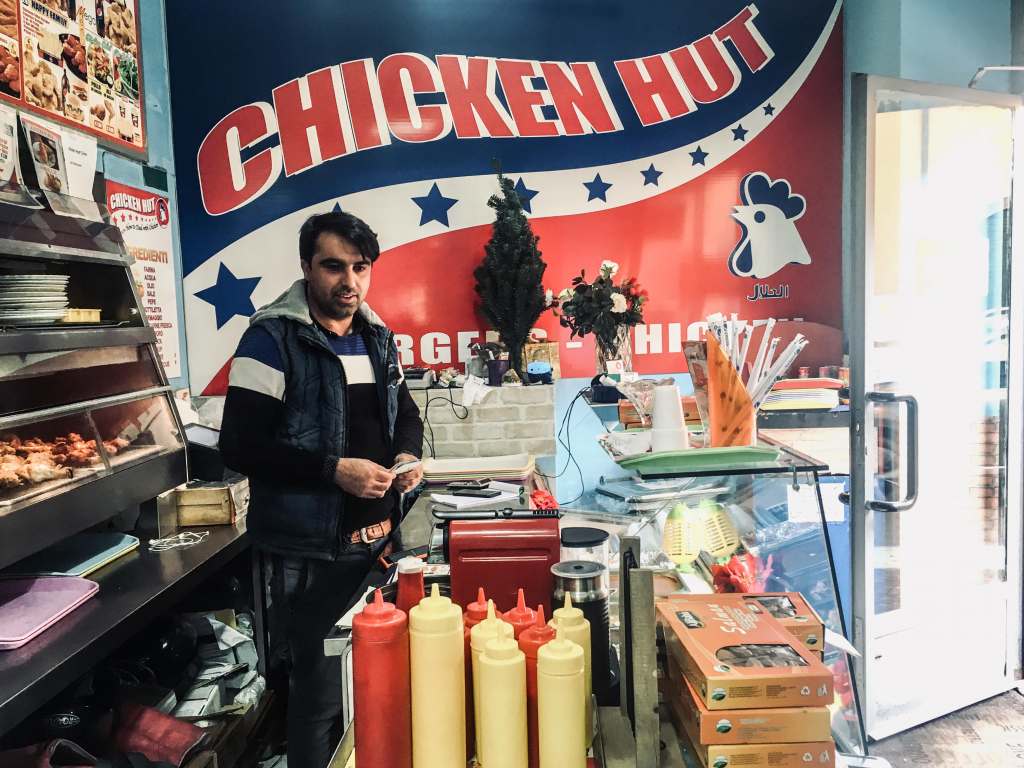 È il momento di Chicken Hut. La friggitoria è stretta e affollata. Un murales bianco e blu in entrata ricorda i chicken shop del sud degli Stati Uniti ma la vicina sala da pranzo sul retro è piena di accenti dell’Africa occidentale che si sommano allo sfrigolare d’olio e qualche chiacchiera in Urdu scambiata tra i cuochi pakistani. Lingue e storie migratorie completamente diverse unite, ancora una volta, dal cibo e dal samosa che ordiniamo. Un tortino di patate e verdure triangolare, che pur essendo di origine indo-pakistana si è diffuso anche in Africa.