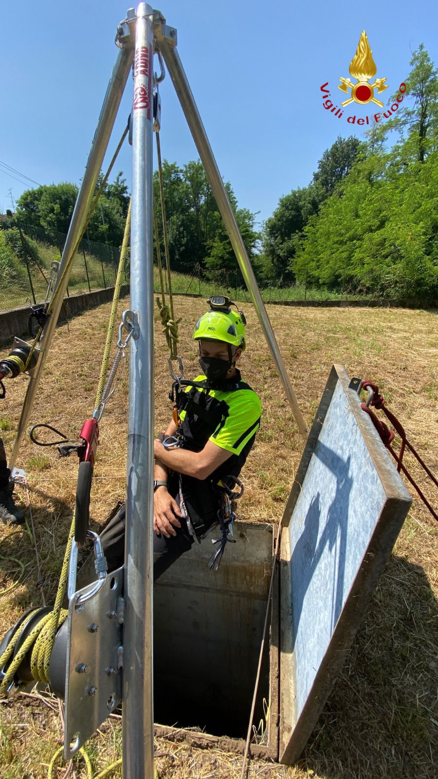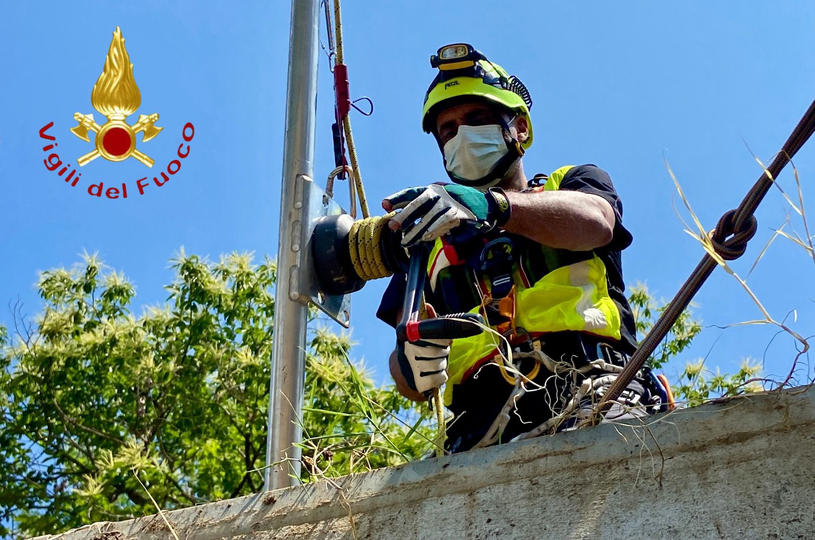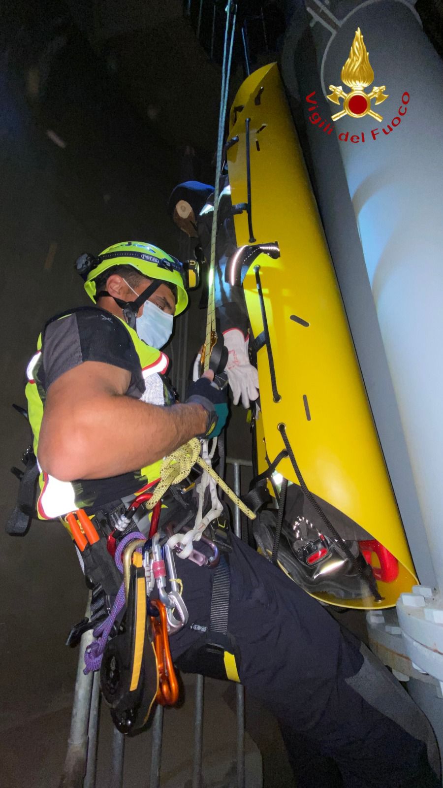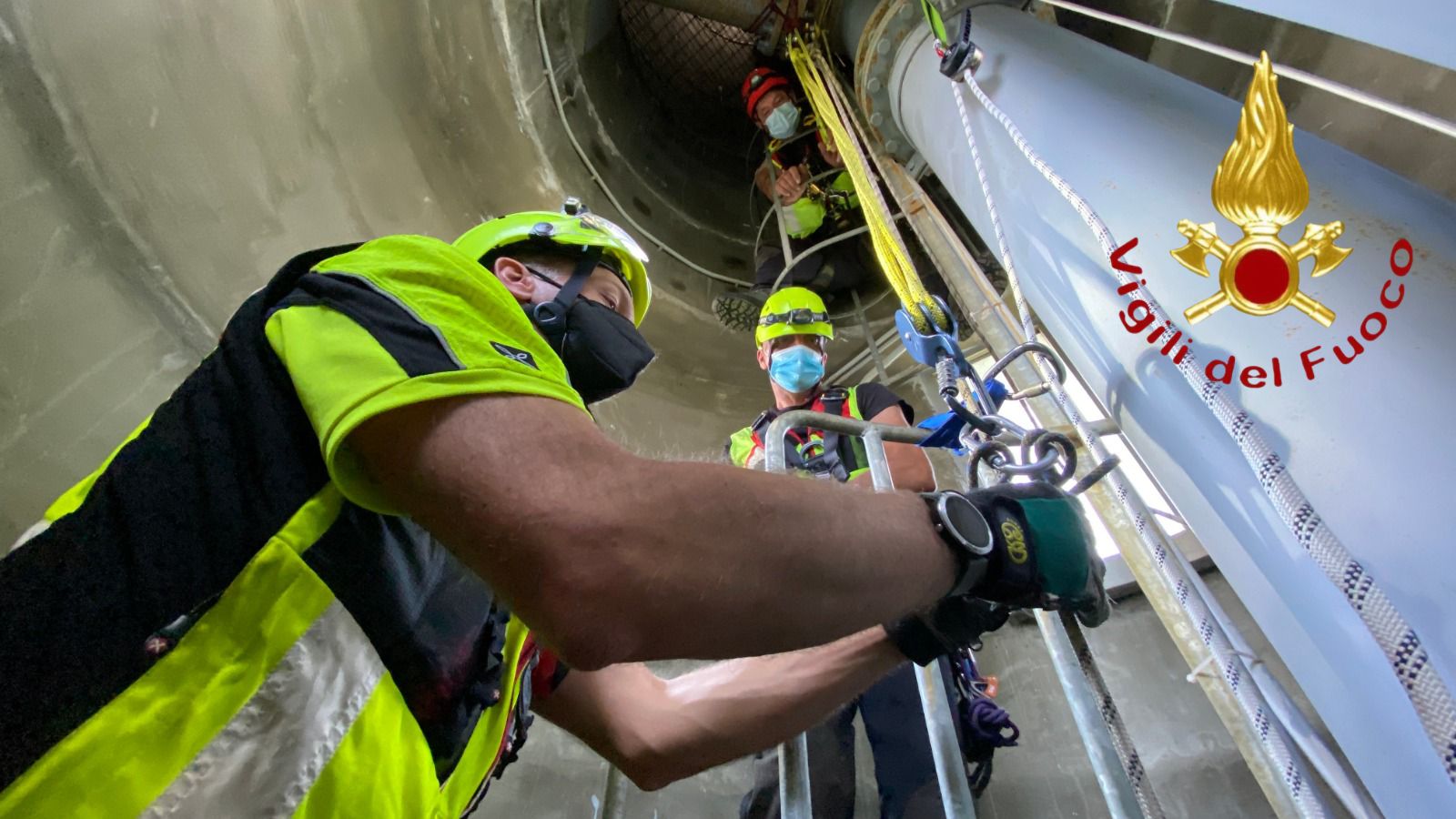 L’esercizio ha permesso di testare il soccorso in ambiente civile e industriale con tecniche speleo-alpinistiche.
