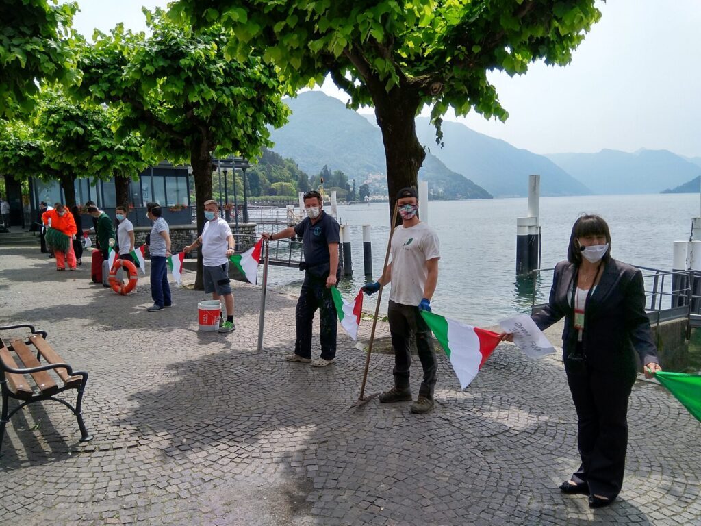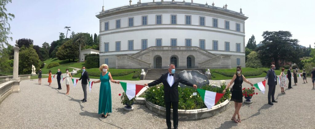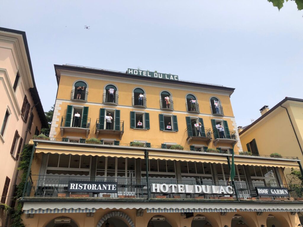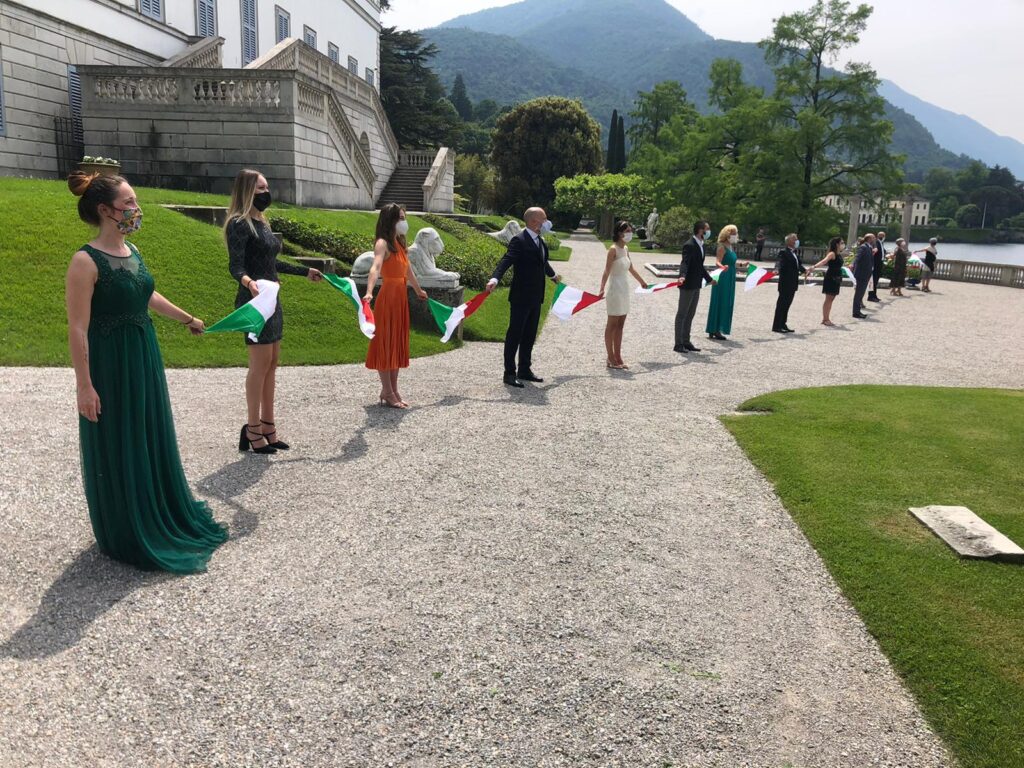 I droni hanno ripreso i cittadini in tre location differenti: in divisa da lavoro sul lungolago di piazza Mazzini, affacciati alle finestre di un hotel in centro paese e vestiti con abiti eleganti all’interno dei Giardini di Villa Melzi.