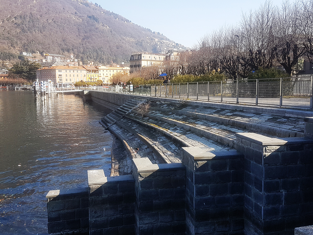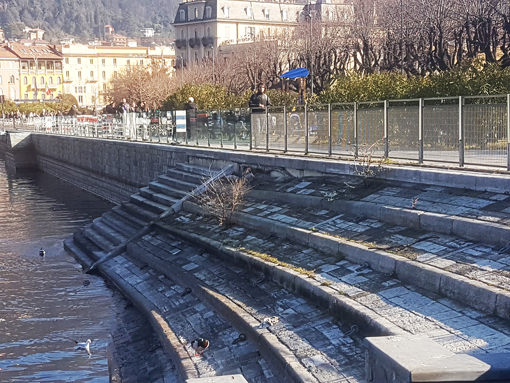 I lavori annunciati dalla Regione dovrebbero iniziare a settembre di quest’anno. Entro il 2022 lo sciagurato cantiere paratie dovrebbe chiudersi dopo un decennio abbondante di scandali. Intanto il lungolago è lì. Mezzo chiuso, mezzo aperto. L’ormai ex passeggiata Amici di Como, tornata nelle competenze del comune segnala l’antico problema, la storica scalinata che si allunga fino alle acque del lago continua a scivolare.