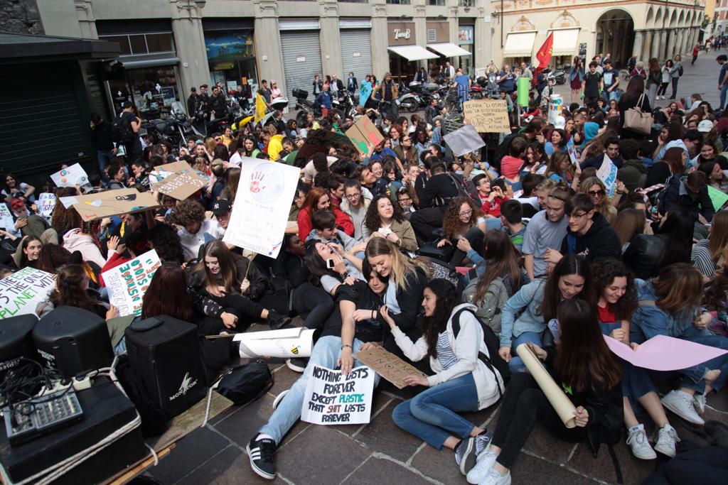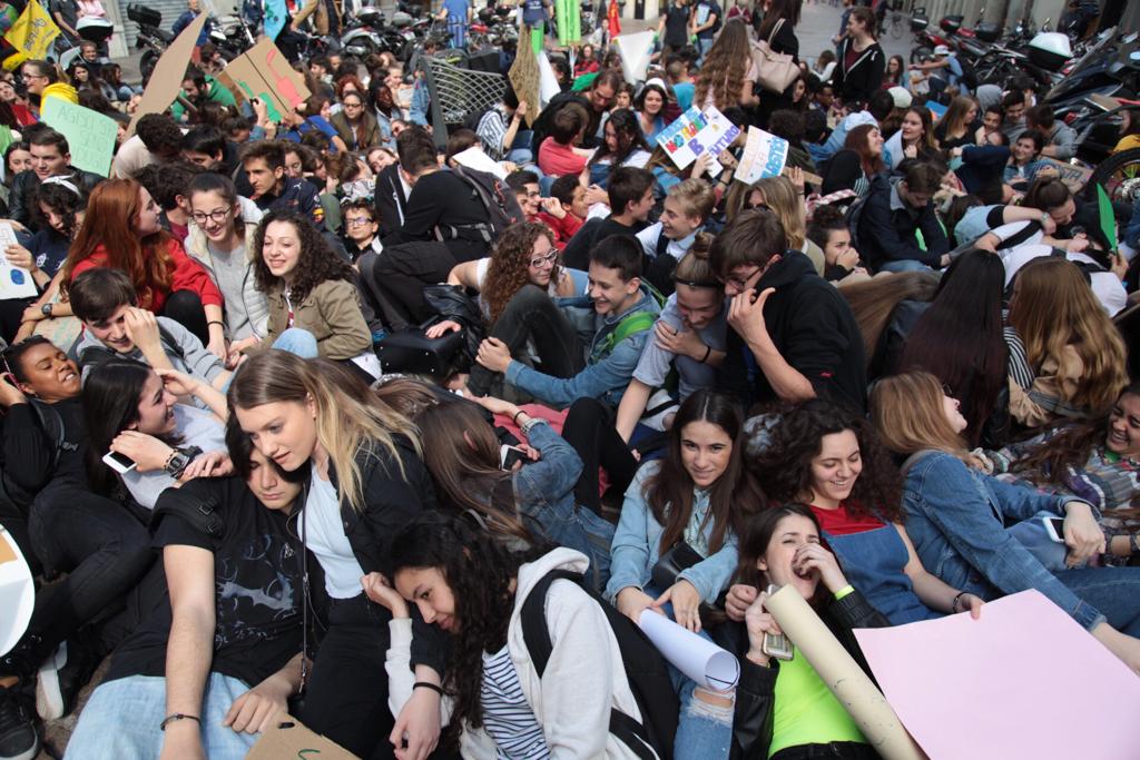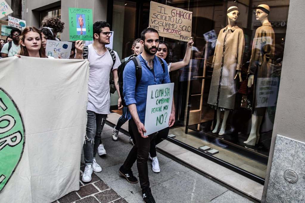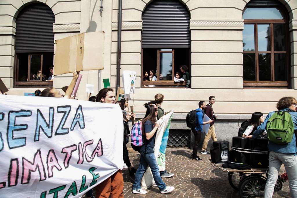 “Spegnete il motore per un mondo migliore” il corteo impiega il più possibile ad attraversare viale Cesare Battisti bloccando il traffico.