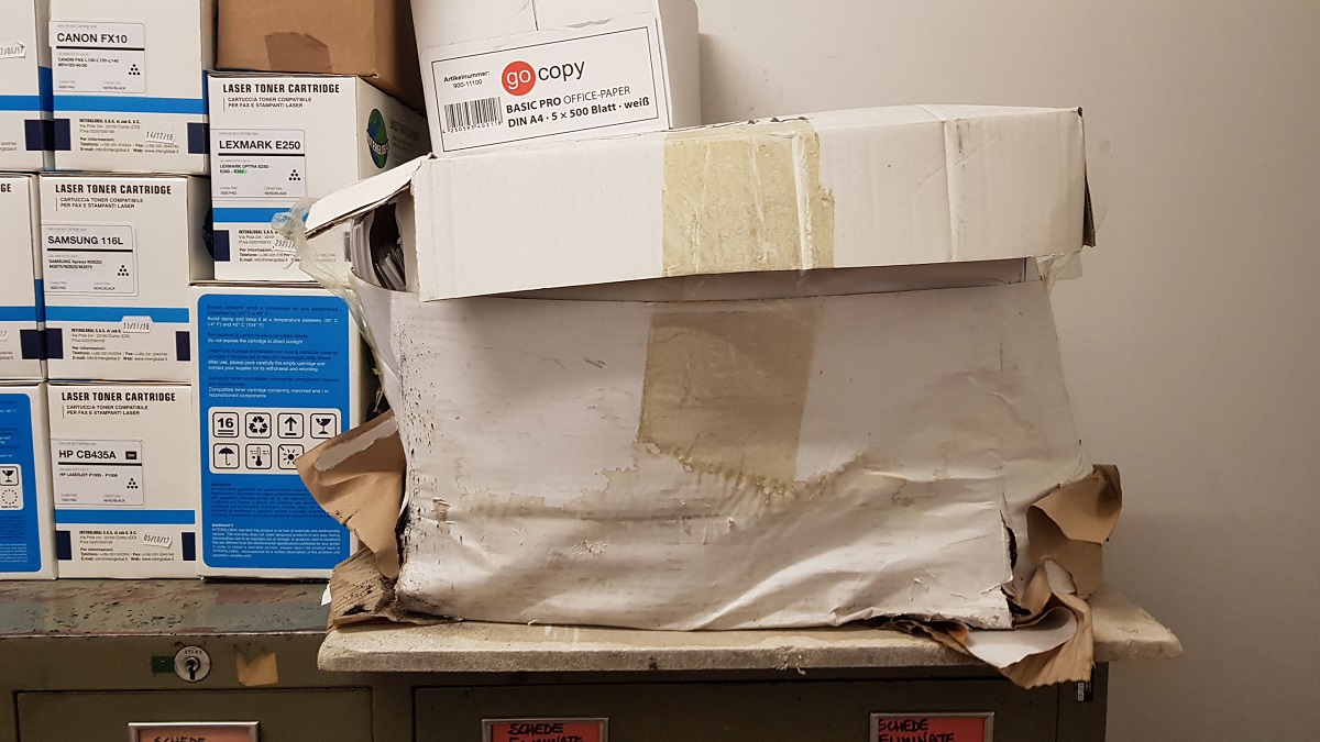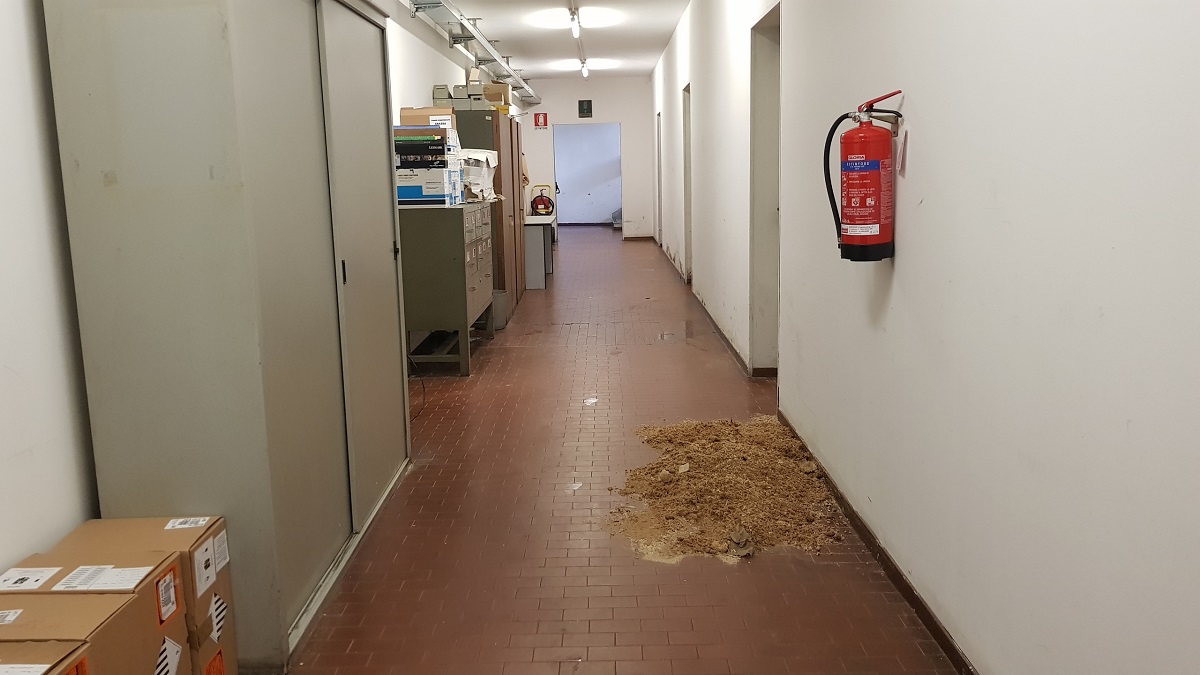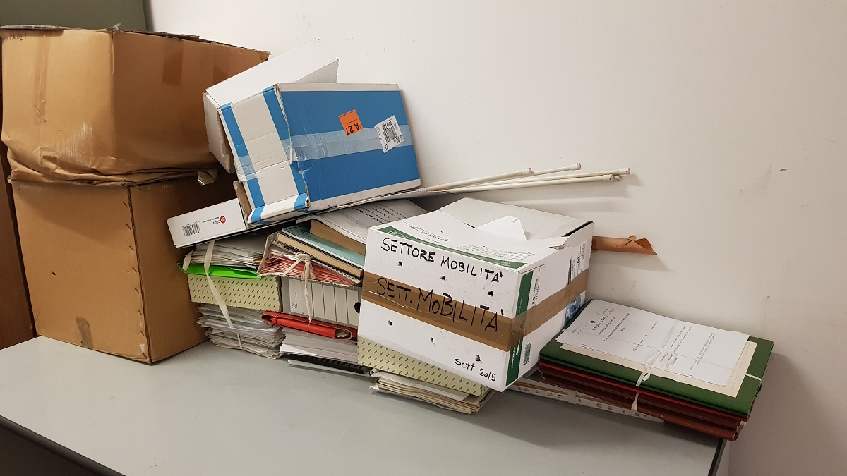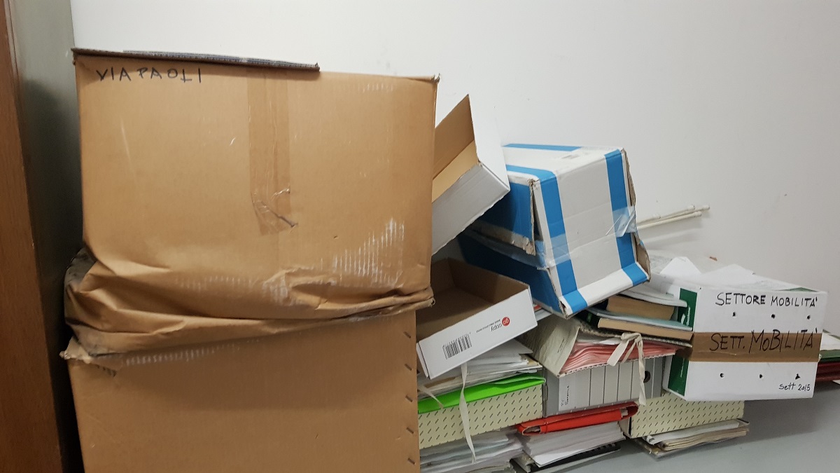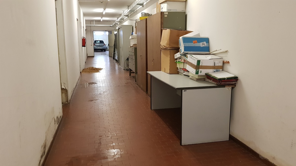 Oggi, come testimoniano le immagini, rimanevano alcune pozzanghere a terra, un cumulo di segatura utilizzata in prima battuta per asciugare e qualche scatolone (curiosamente anche di progetti del Settore Mobilità piuttosto recenti datata 2015) appoggiati alla bell’e meglio su alcuni scaffali.