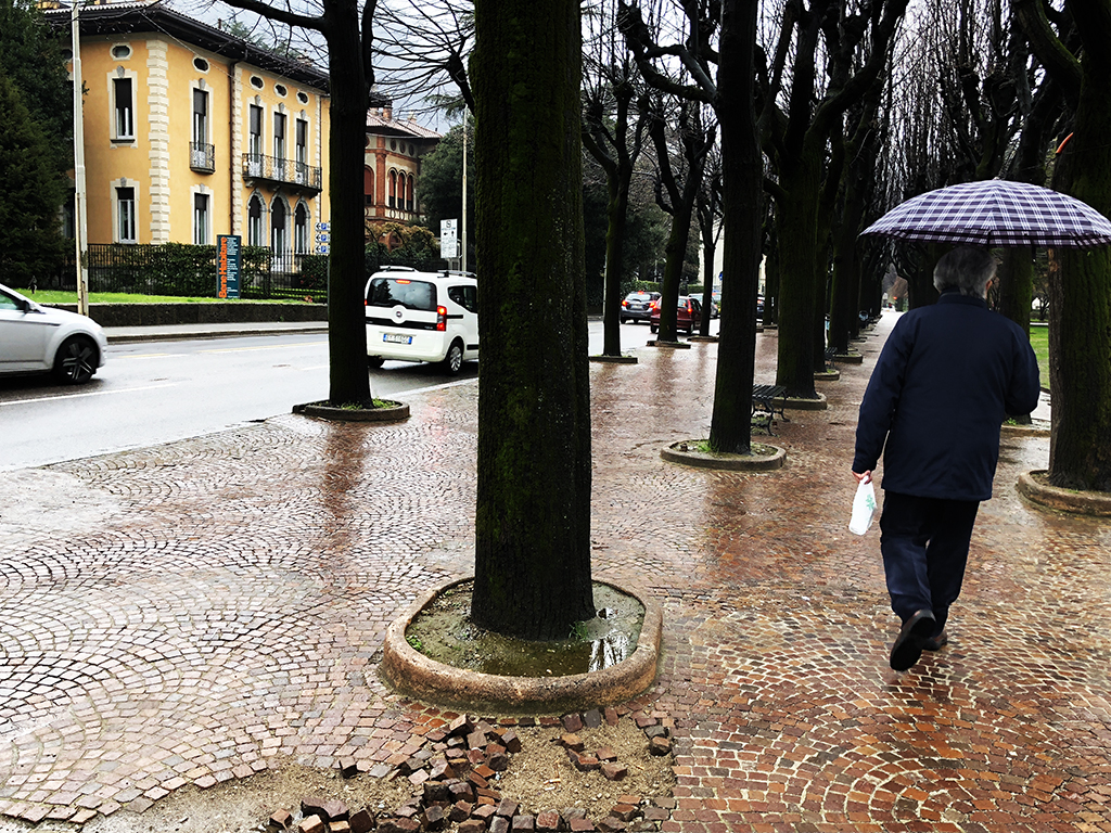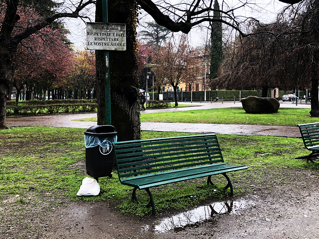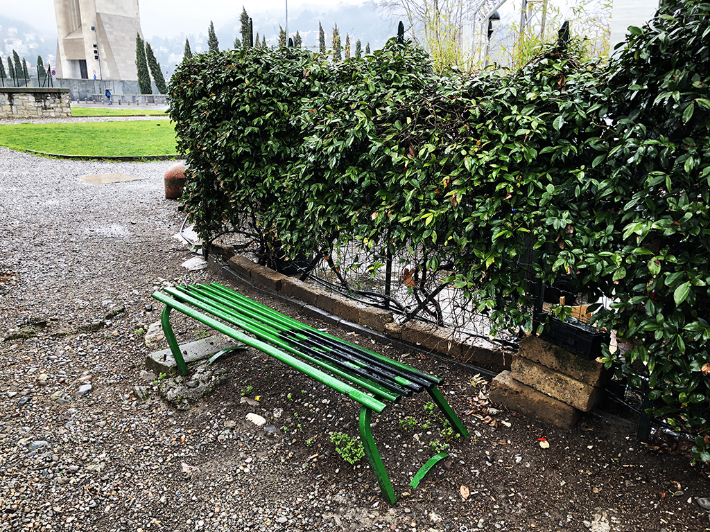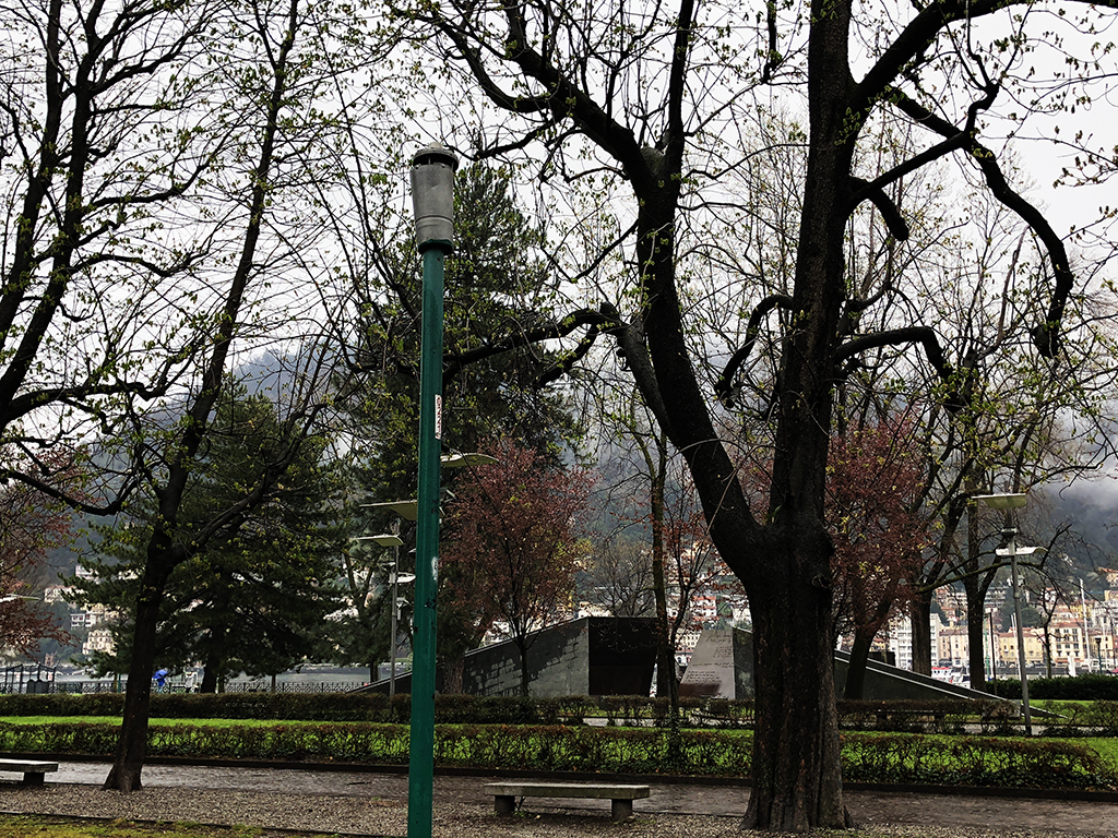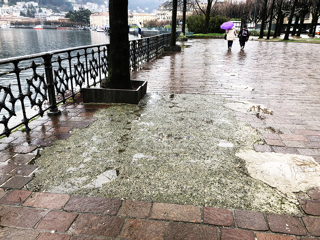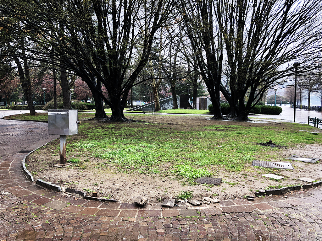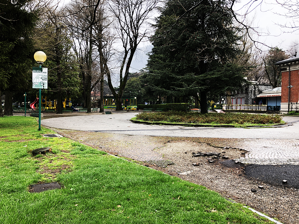 Intorno però la situazione è tutt’altro che gradevole. Mattonelle rialzate, pattumiera abbandonata, lampioni rotti e panchine devastate sono solo alcuni segni del degrado dei Giardini a Lago che circondano il tempio voltiano e si affacciano sul lago.