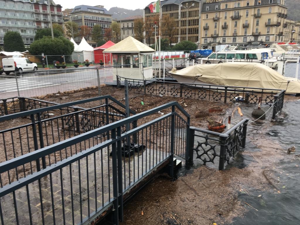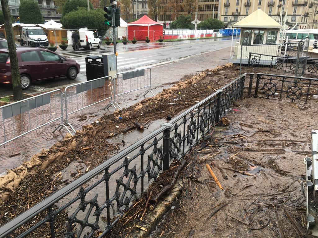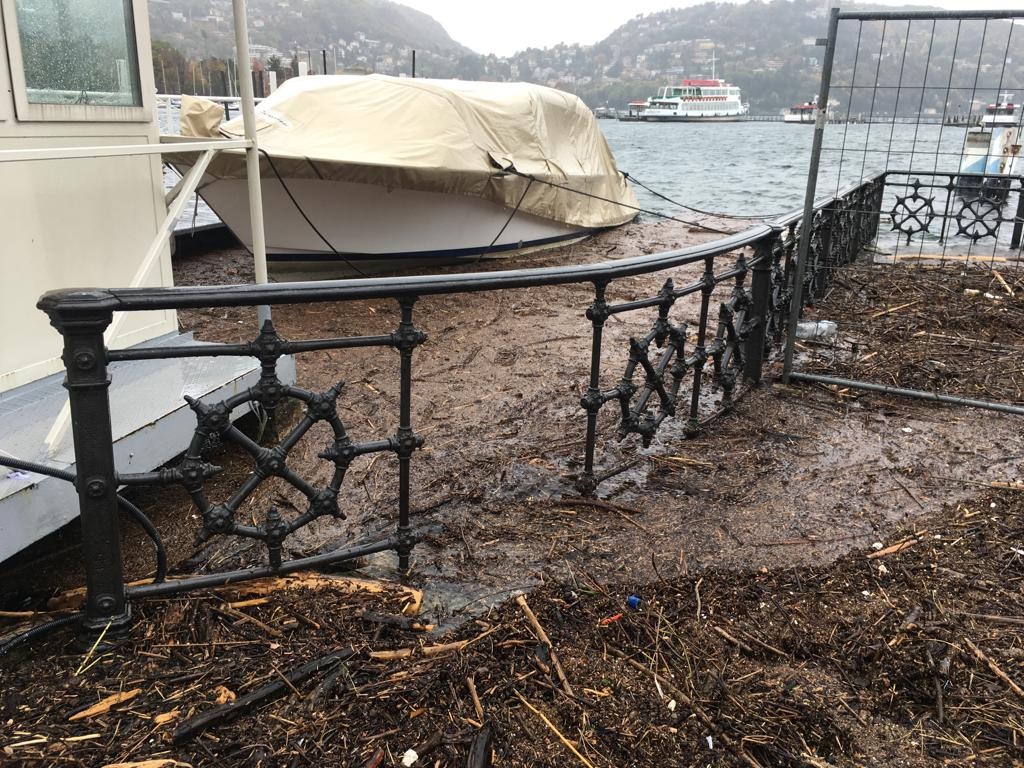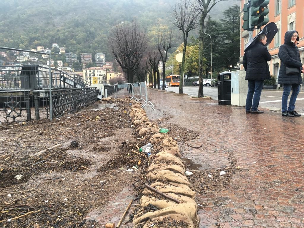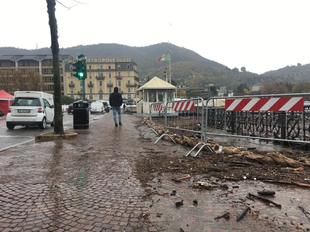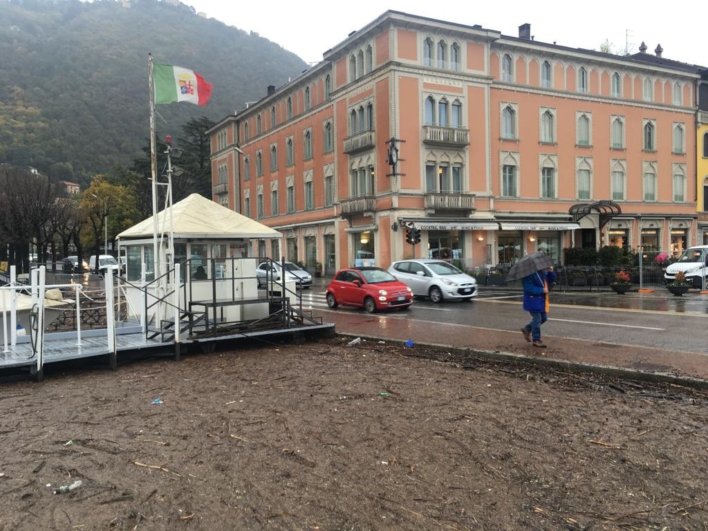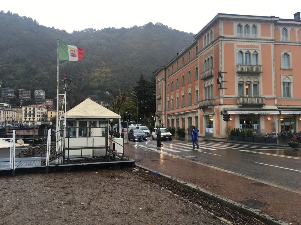 Lago sempre più “grosso” e sporco davanti a piazza Cavour. Le incessanti pioggie della notte, destinate secondo le previsioni meteo a proseguire intense praticamente per tutta la giornata, hanno innalzato il livello del Lario fino a 98,5 centimetri sopra lo zero idrometrico.