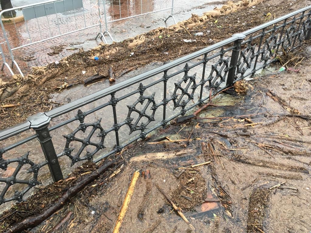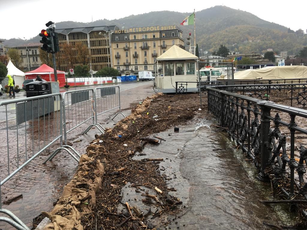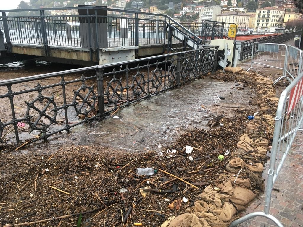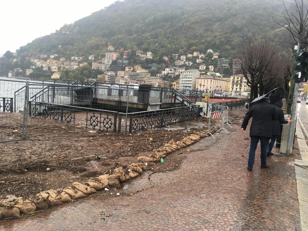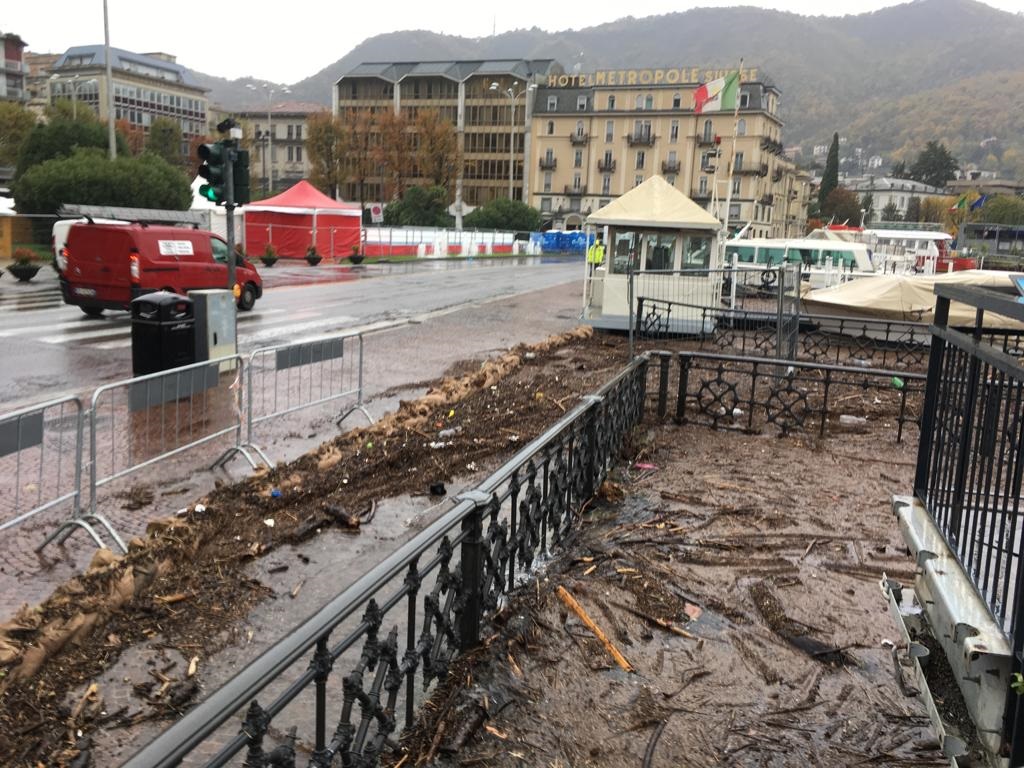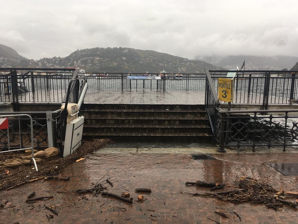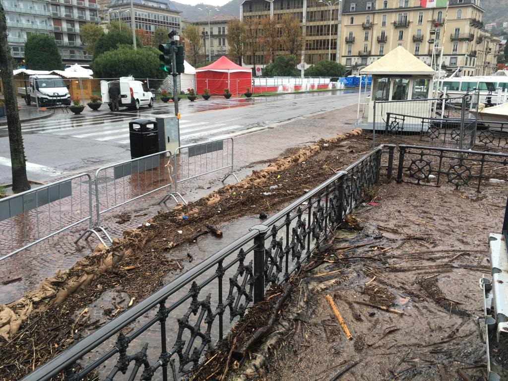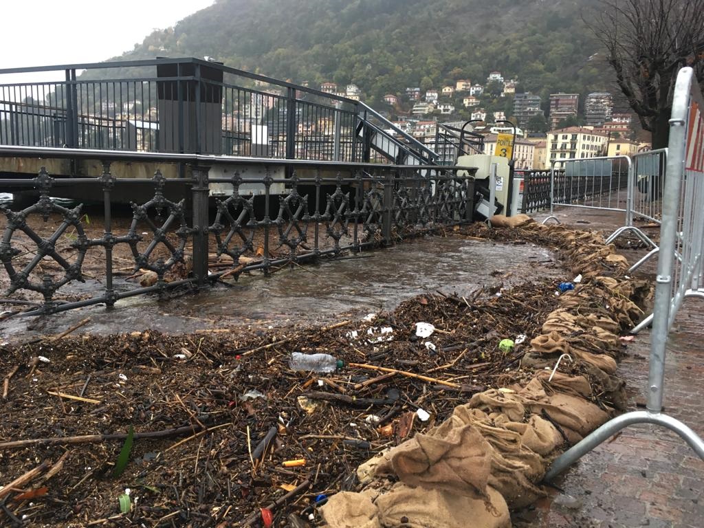 Lago sempre più “grosso” e sporco davanti a piazza Cavour. Le incessanti pioggie della notte, destinate secondo le previsioni meteo a proseguire intense praticamente per tutta la giornata, hanno innalzato il livello del Lario fino a 98,5 centimetri sopra lo zero idrometrico.