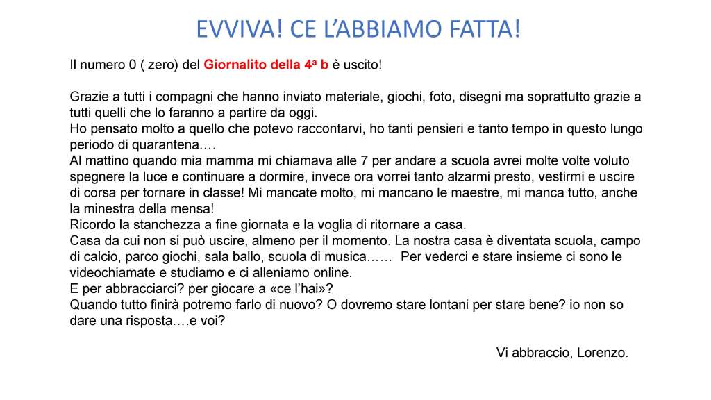 “Sia alle maestre sia alla preside è piaciuto molto questo progetto, tanto che la preside stessa lo ha inserito nel portal informatico dell’Istituto – continua Stefano – Lorenzo ne è molto orgoglioso, si impegna tanto nel suo ruolo di caporedattore e sta imparando a utilizzare svariati programmi soprattutto per impaginare. In questo caso, l’uso differente della tecnologia si sta dimostrando importante e potrà sicuramente servirgli in futuro anche oltre l’emergenza”.