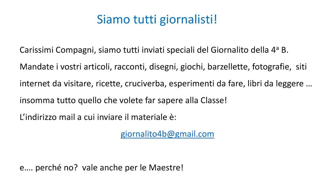 “L’idea è nata da mio figlio Lorenzo circa un mese fa – spiega il papà, Stefano Fasola – non avendo contatti diretti con i compagni di classe, a causa della quarantena, ha pensato di creare una specie di giornalino da condividere tramite email. Il Giornalito ha coinvolto tutta la sua classe, quindi abbiamo chiesto la collaborazione delle insegnanti e della rappresentante di classe per l’invio ogni settimana”.