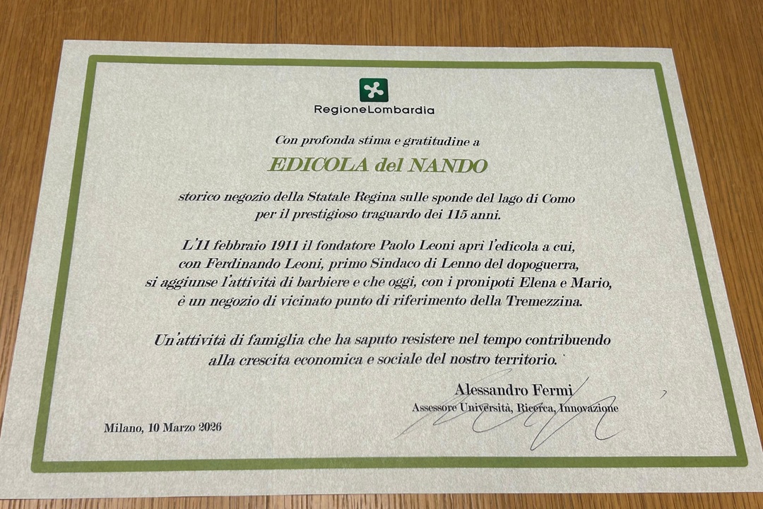 E così questa mattina l’assessore regionale all’Università, Ricerca, Innovazione, il comasco Alessandro, Fermi ha consegnato a Palazzo Lombardia a Mario Cappelletti – attuale proprietario, insieme a Elena Molinari, della storica ‘Edicola del Nando’ di Lenno (Tremezzina/Como) e nipote del fondatore Ferdinando Leoni – una pergamena per celebrare i 115 anni di attività di questo negozio di vicinato a gestione familiare, aperto l’11 febbraio del 1911 e diventato un vero e proprio punto di riferimento per il territorio.