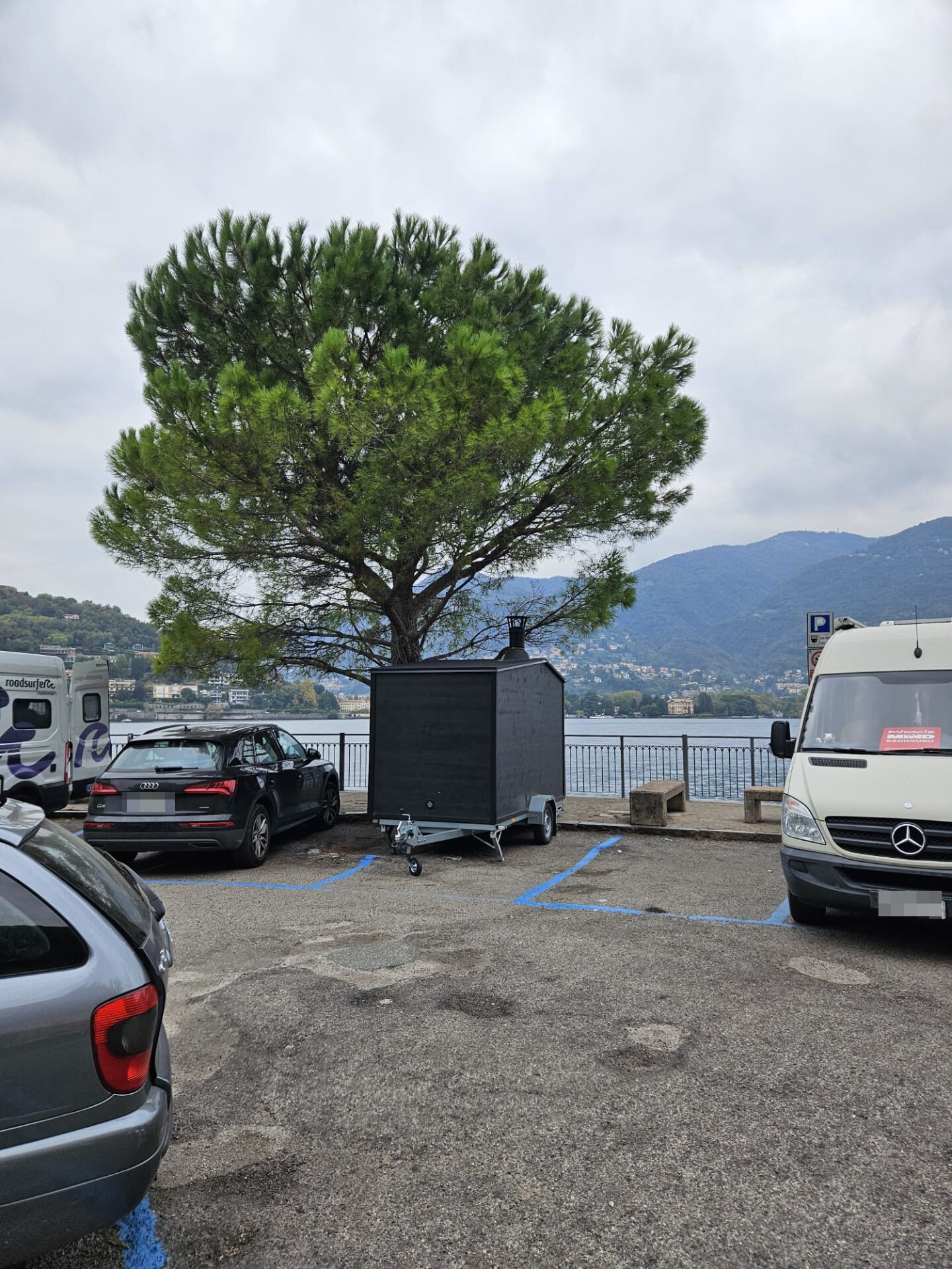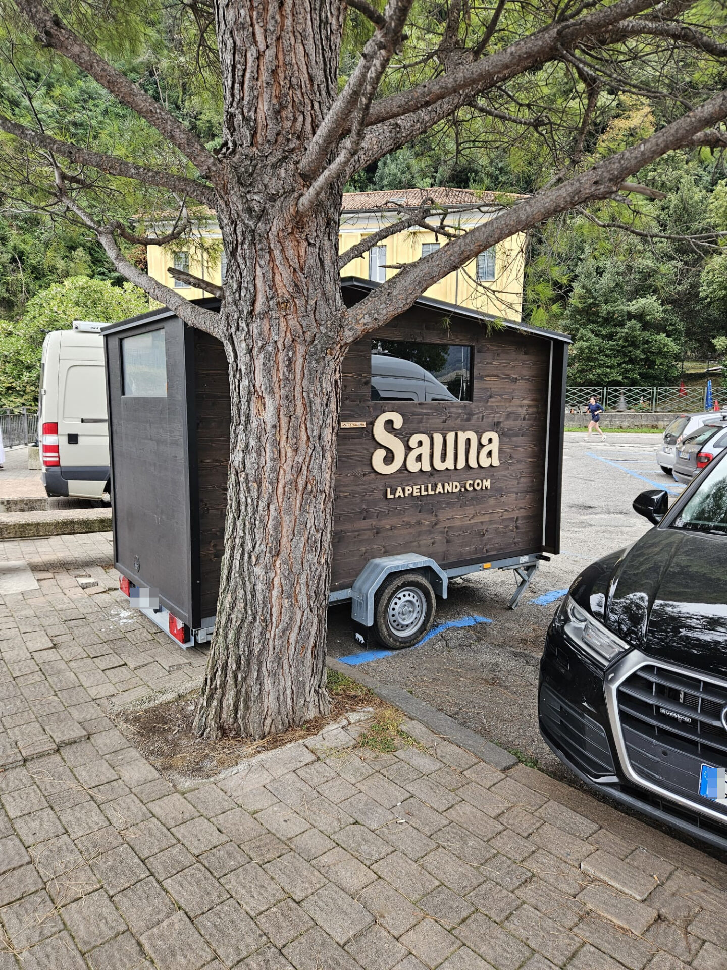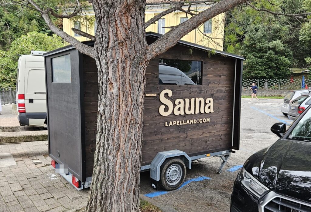 Cioè quando i turisti impavidi sono usciti dal lago e, al posto del solito banalissimo asciugamano ritemprante, hanno optato per il servizio portato da casa. Ovvero, come si vede bene dalle immagini, per la sauna su carrello trasportabile piazzata nel parcheggio.