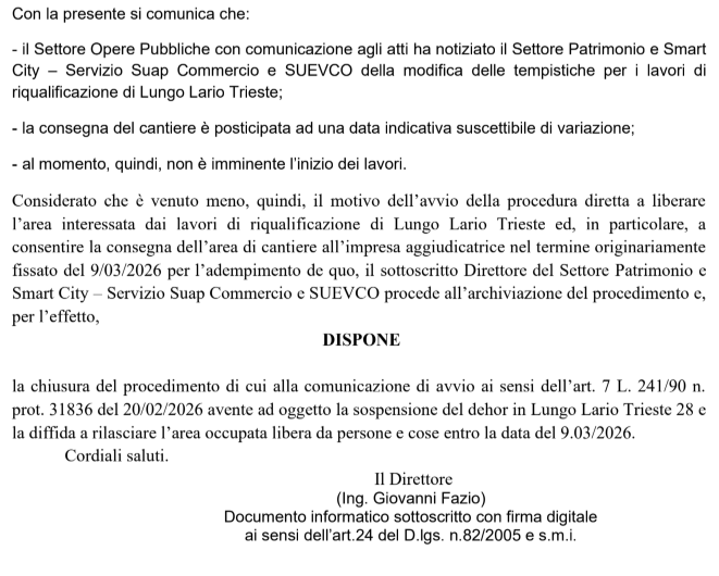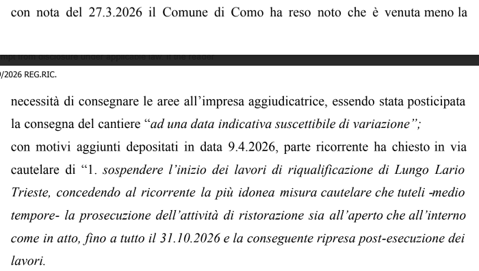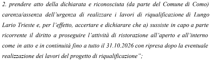 Il Tar Milano infatti ha dato atto che, in seguito ai ricorsi da parte del Bar Lario e del ristorante Lago Food, depositati il 26 febbraio scorso, il Comune di Como ha revocato, il 7 marzo ha revocato l’invito alla rimozione delle strutture esterne, che sarebbe dovuto avvenire entro il 9 dello stesso mese, disponendo l’archiviazione del procedimento. L’esigenza cautelare, quindi, allo stato, non sussiste più. Il Comune, in autotutela, a seguito dei ricorsi,<“Ha definito il procedimento avviato con la comunicazione 20 febbraio, avente ad oggetto la sospensione dell’occupazione dell’area dehors, dando atto che e venuto meno il motivo dell’avvio della procedura diretta a liberare l’area interessata dai lavori di riqualificazione” e che è venuta meno la necessità di consegnare le aree all’impresa.