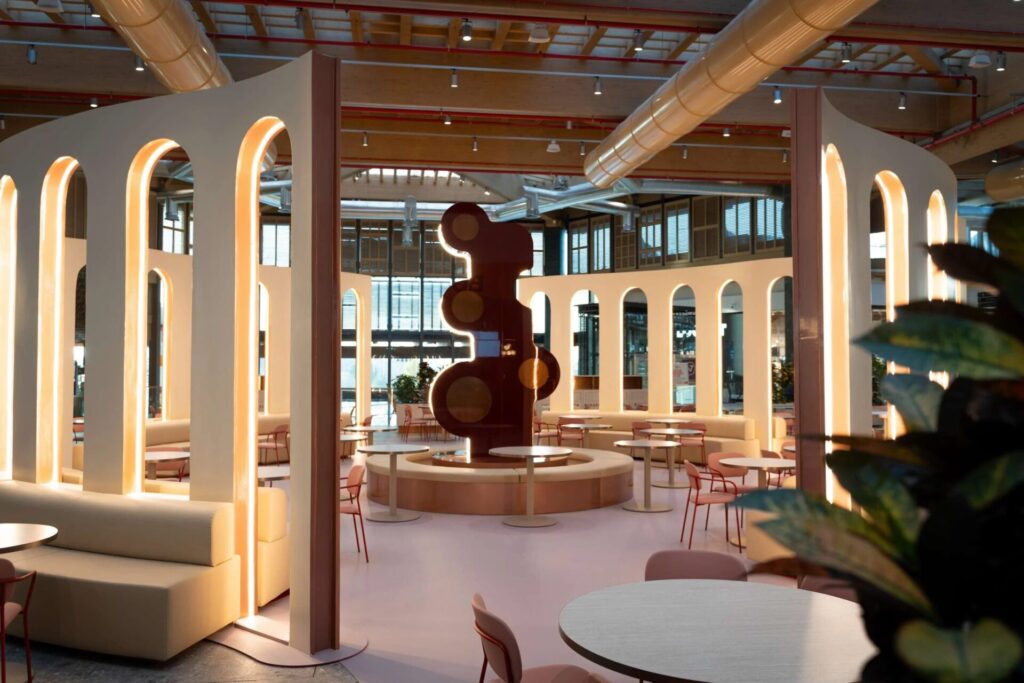 Il cuore pulsante della food court è Dream Up, un’installazione scenografica progettata dallo Studio Nick Maltese (Nick Maltese e Federico Pagetti). Non si tratta di un semplice arredo, ma di un percorso immersivo che invita i visitatori a riscoprire il valore della condivisione e del tempo.