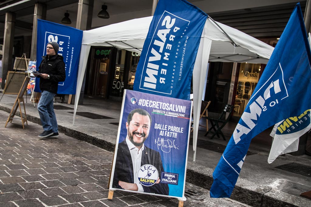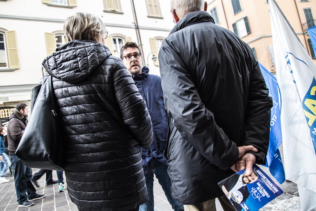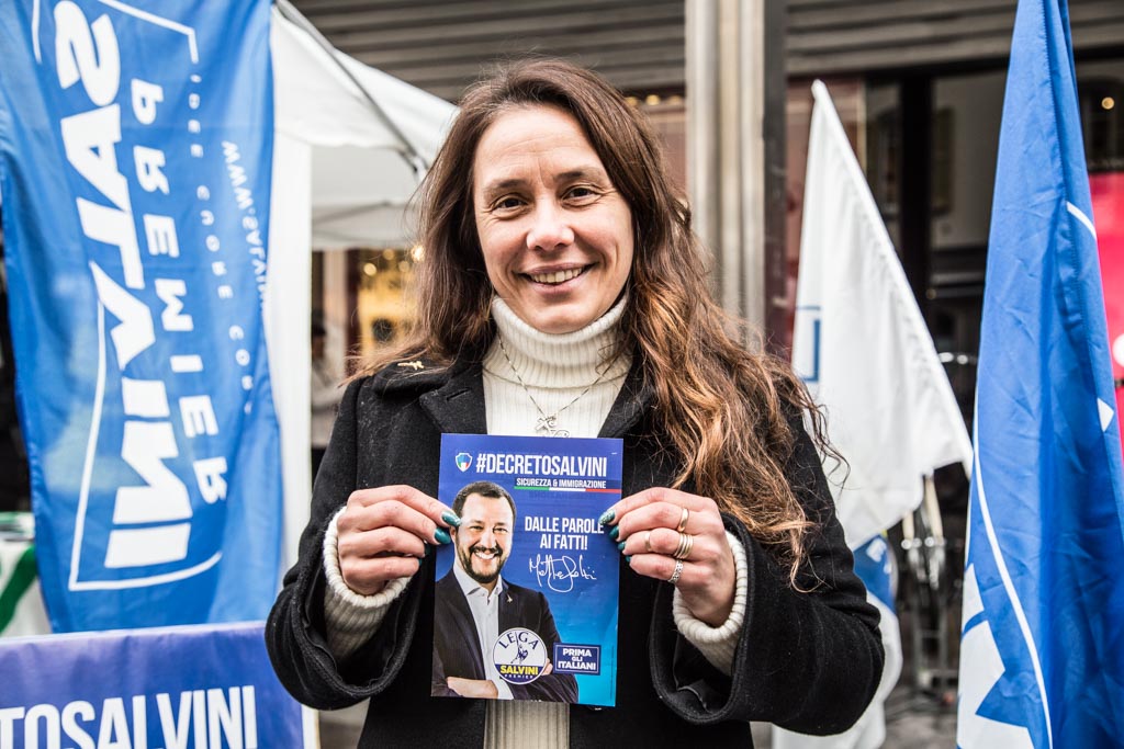 Sono appena passate le dieci e trenta, quando i primi militanti e simpatizzanti delle Lega scandagliano via Boldoni distribuendo volantini blu con il volto di Matteo Salvini. Sotto il gazebo bianco, l’immancabile rosa delle alpi e qualche gadget. Le bandiere “Salvini Premier” sono già in bella vista, mosse lentamente dal vento freddo.“Chiamiamo Alessandra, un secondo”, un militante ribatte subito.