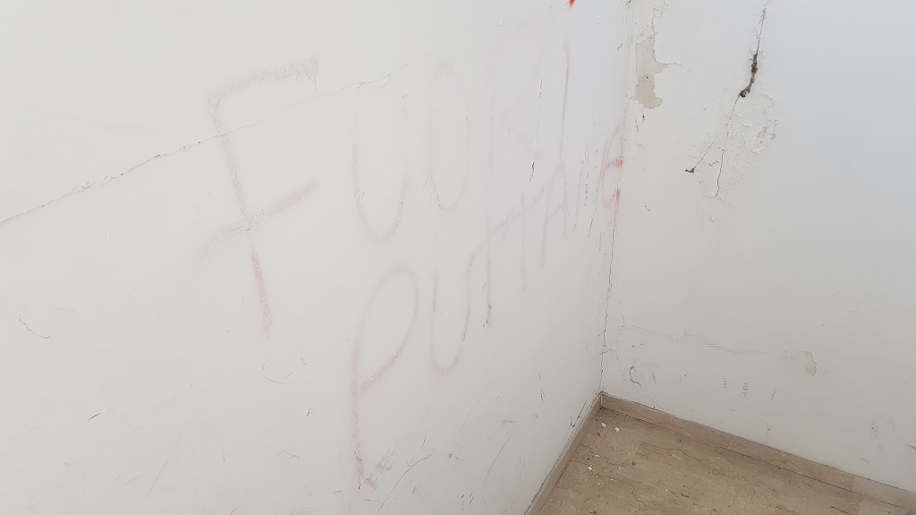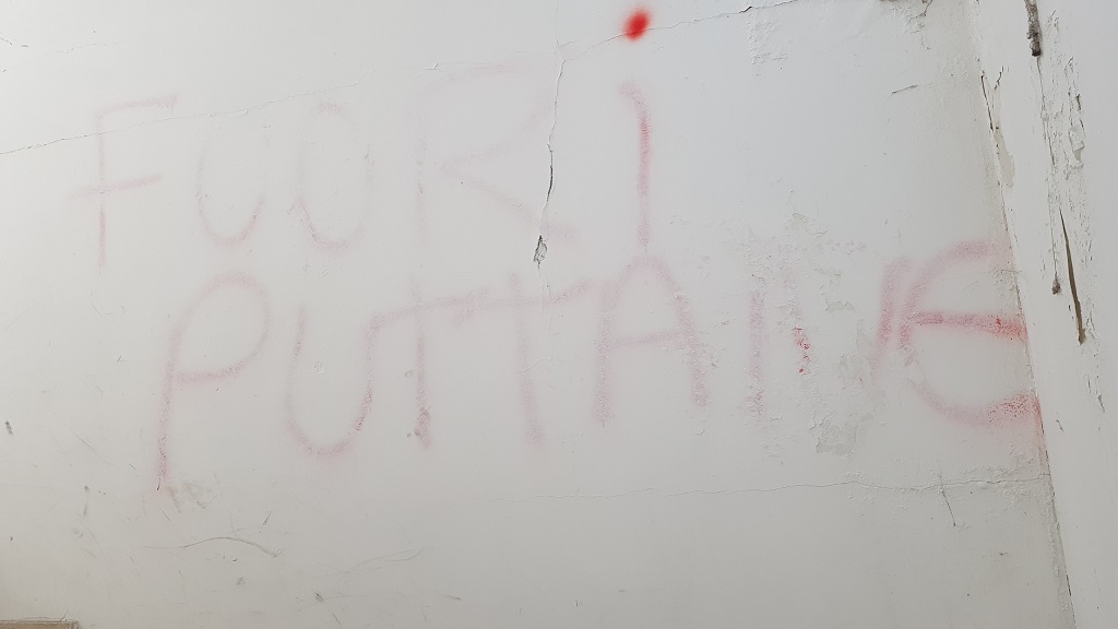 Vanno aiutati. Perché deve far paura la notte, là dentro. Altrimenti non si spiegherebbero le enormi scritte rosse su uno dei pianerottoli bianchi mezzi deserti con la scritta “FUORI PUTTANE”, “BASTA”.