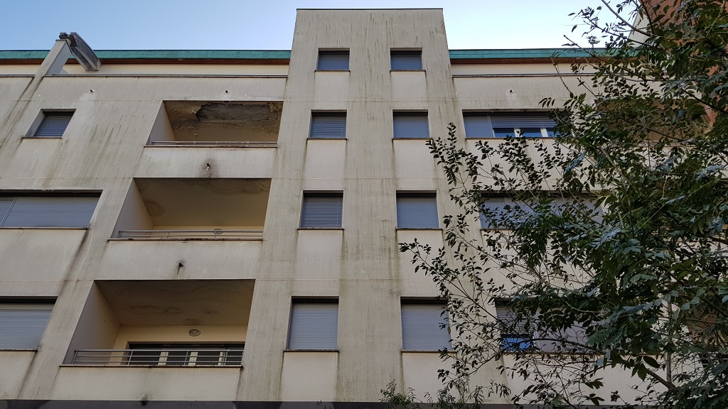 Ci si trova, improvvisamente, minuscoli in mezzo al viale che sfocia dall’altro capo della landa, in via Cuzzi, oppressi da grandi pareti pallide e rugose, scalcinate. Senza vita, dietro gli sguardi vuoti delle finestre, serrate nella quasi totalità, le ciglia dei balconi fatte di intonaco scrostato. In quell’istante, capisci che le Residenze di Camerlata vogliono mangiarti.