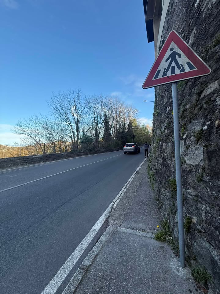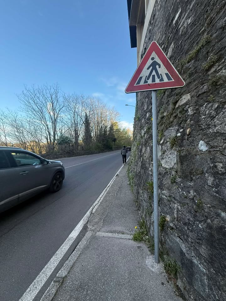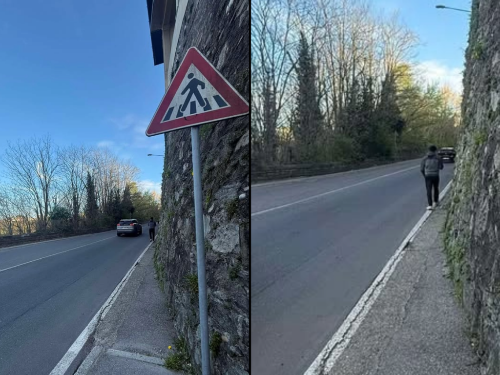 Segnalo in via Statale per Lecco , in salita dopo la curva , il pedone dovrebbe attraversare ma il cartello c’è e le strisce no. C’è qualcosa che non va.