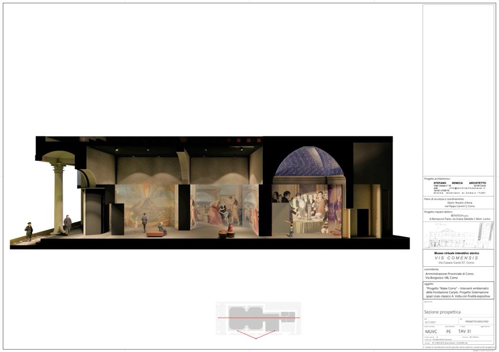 Entro l’estate finiranno i lavori edili per sistemare gli spazi, ora occupati da due aule del liceo Volta, e poi scatterà “l’allestimento vero e proprio del museo virtuale che si conta di aprire entro la fine dell’anno”, spiega l’architetto Stefano Seneca che ha curato il progetto di questo spazio dove si restituirà splendore ai padri fondatori di Como. “Sarà un museo composto da tre sale. Il progetto prevede una quinta e un guscio con dei pannelli alti 4 metri dove verranno proiettati i contenuti multimediali”, spiega l’architetto Seneca.