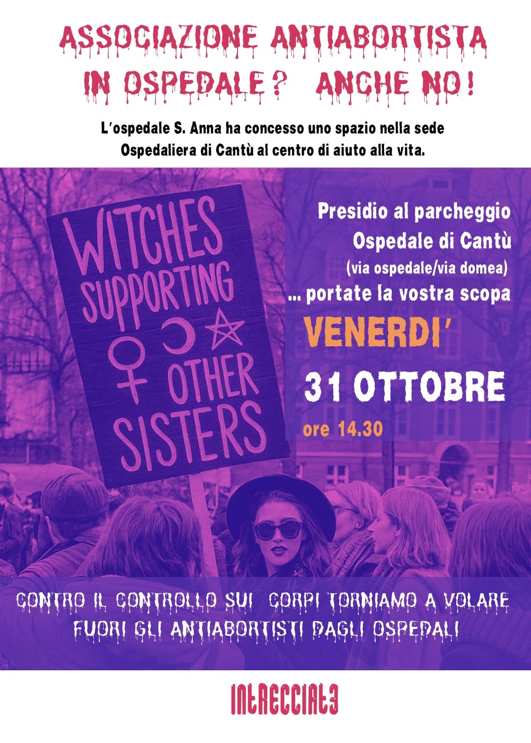 La rete intrecciat3 ricorda che venerdì 31 ottobre dalle 14.30 alle 17.30 sarà in presidio fuori dall’Ospedale di Cantù, fa appello a tutte le realtà del territorio e a tutte le persone interessate a difendere e riaffermare il diritto delle donne all’autodeterminazione.