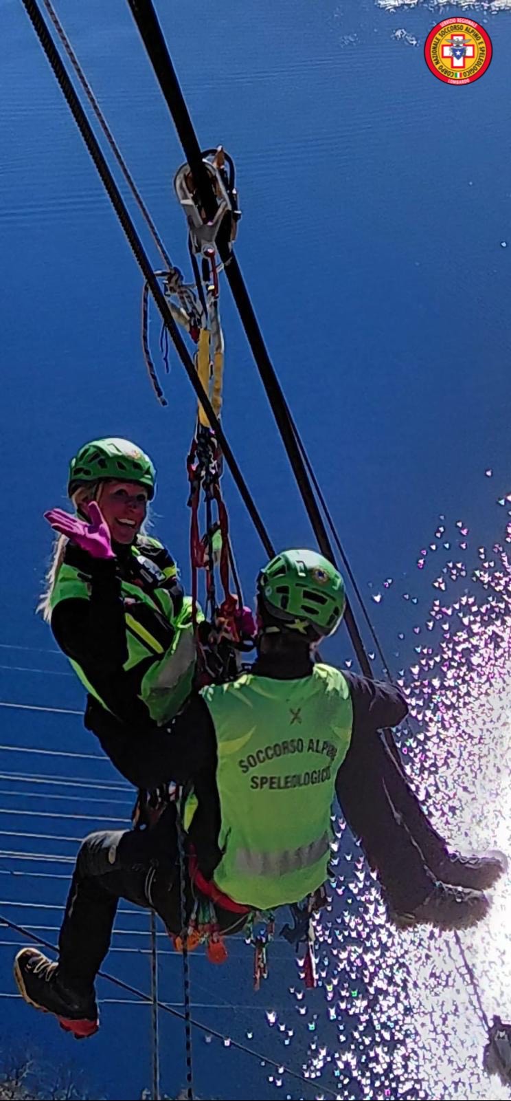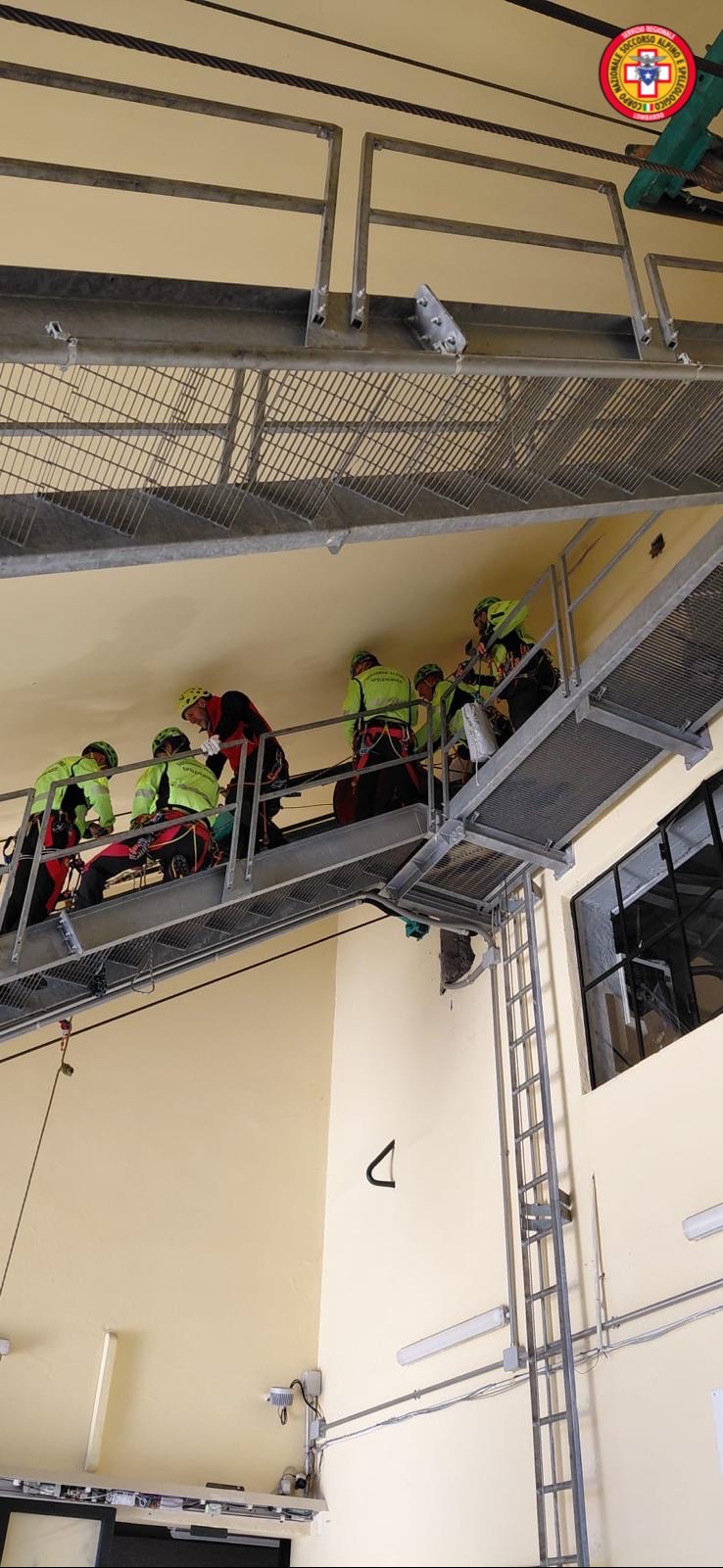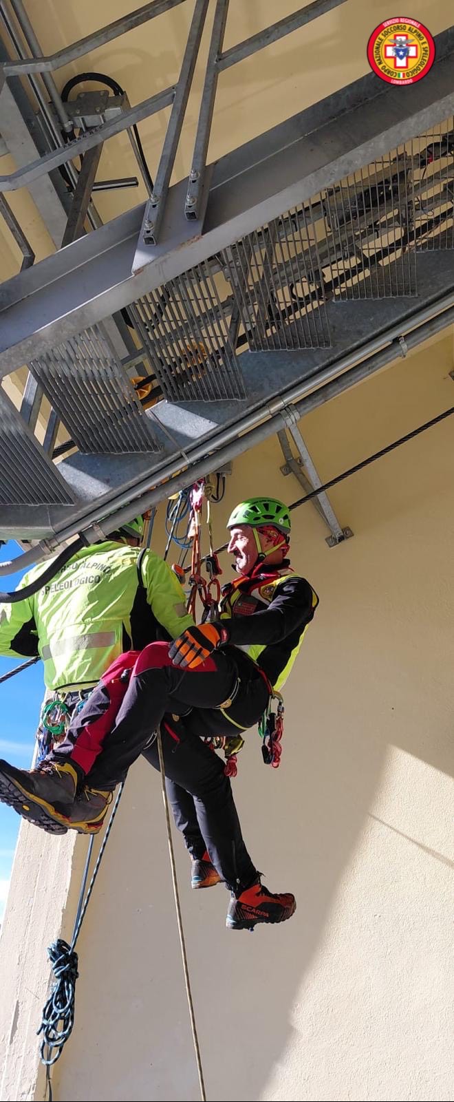 predisposta anche una fune guida per la sicurezza, una volta giunti a terra. Tutti i partecipanti hanno alternato il ruolo di figurante e di soccorritore per verificare le procedure da entrambi i punti di vista. I tecnici hanno percorso circa 50 metri per raggiungere il tetto della struttura, poi hanno eseguito ancoraggi e brevi calate per lo sblocco e l’allestimento delle discese individuali.
