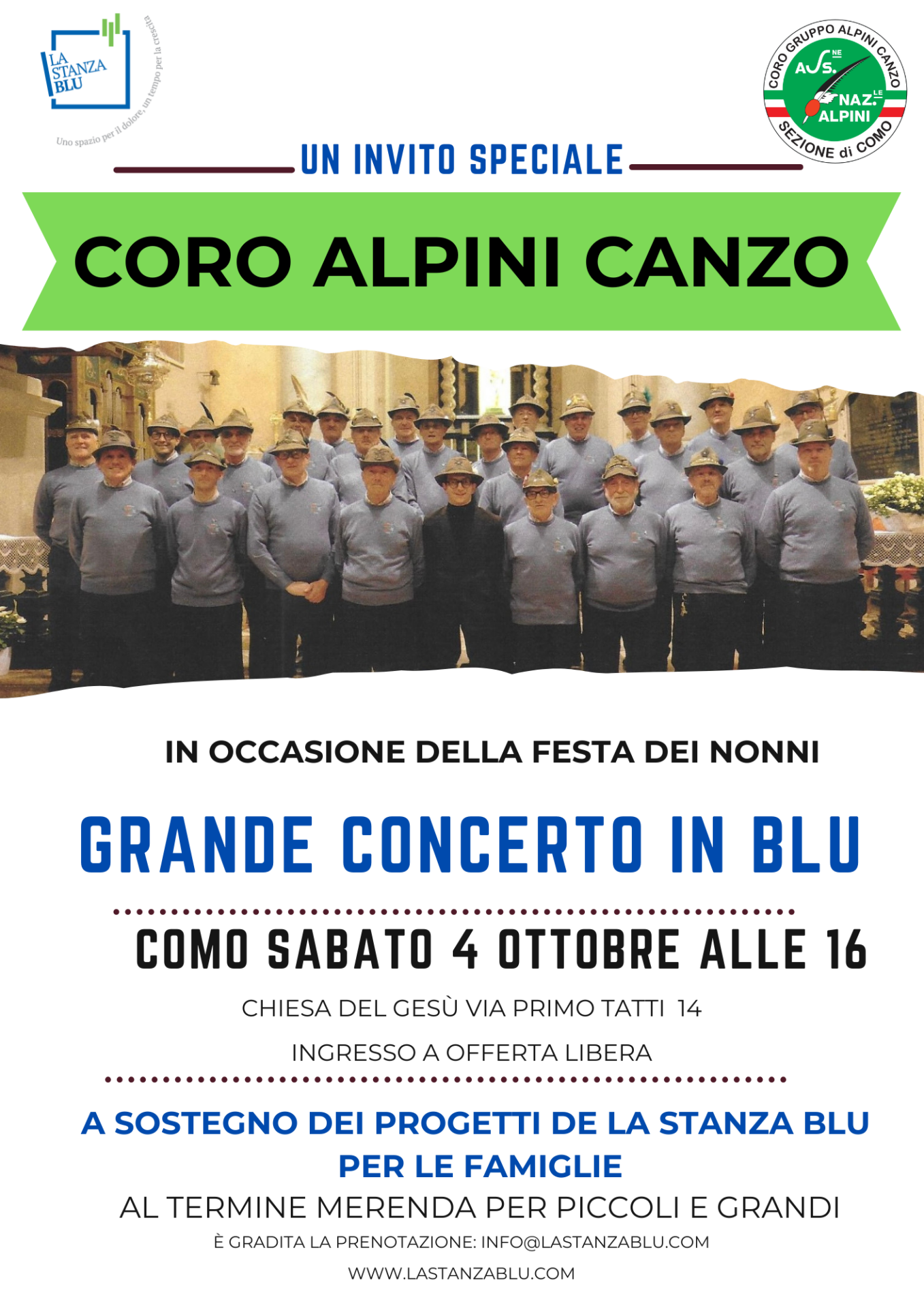 La Festa dei nonni avrà quest’anno un protagonista d’eccezione: il Coro Alpini Canzo che ha generosamente deciso di cantare a sostegno dei progetti di accompagnamento delle famiglie fragili seguite dall’equipe de La Stanza Blu e si esibirà nel Grande Concerto in Blu sabato 4 ottobre alle 16 nella Chiesa del Gesù, in via Primo Tatti 14 a Como.