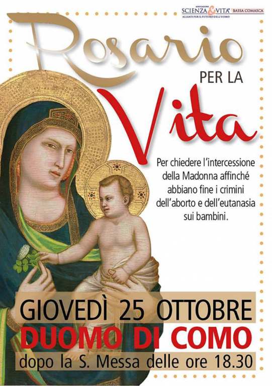 Scienza e Vita è invece un’organizzazione pro-life nazionale, con una sede a Guanzate. Il sodalizio come da annuncio, giovedì 25 ottobre, ha dato il via al primo Rosario per la Vita: una serie di sessioni di preghiera per “chiedere l’intercessione della Madonna affinché abbiano fine i crimini dell’aborto e dell’eutanasia sui bambini”.