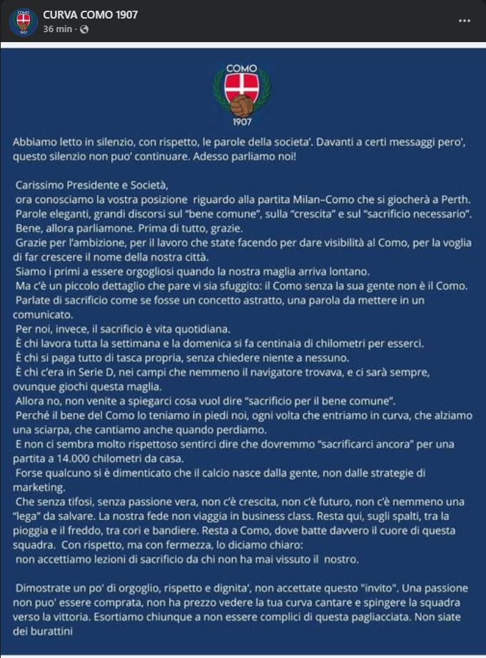 Il sì incondizionato del Como 1907 alla lunghissima trasferta in Australia dei lariani per la partita con il Milan non ha convinto tutti i tifosi comaschi. Anzi, tutt’altro. Questa mattina, martedì 14 ottobre, dalla pagina ufficiale Curva Como 1907 è arrivata una secca presa di posizione contro la partita spostata all’altro capo del mondo e un no durissimo all’invito rivolto dal club a 50 sostenitori per andare a Perth (qui i dettagli).