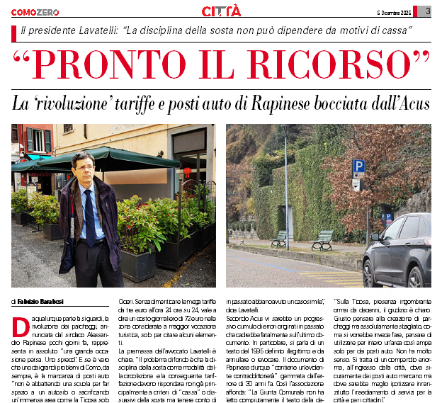 Partiamo con la riforma della sosta recentemente varata dall’Amministrazione del sindaco Alessandro Rapinese. C’è l’Acus – Associazione civica utenti della strada presieduta dall’avvocato Mario Lavatelli – che annuncia ricorso e lo motiva.