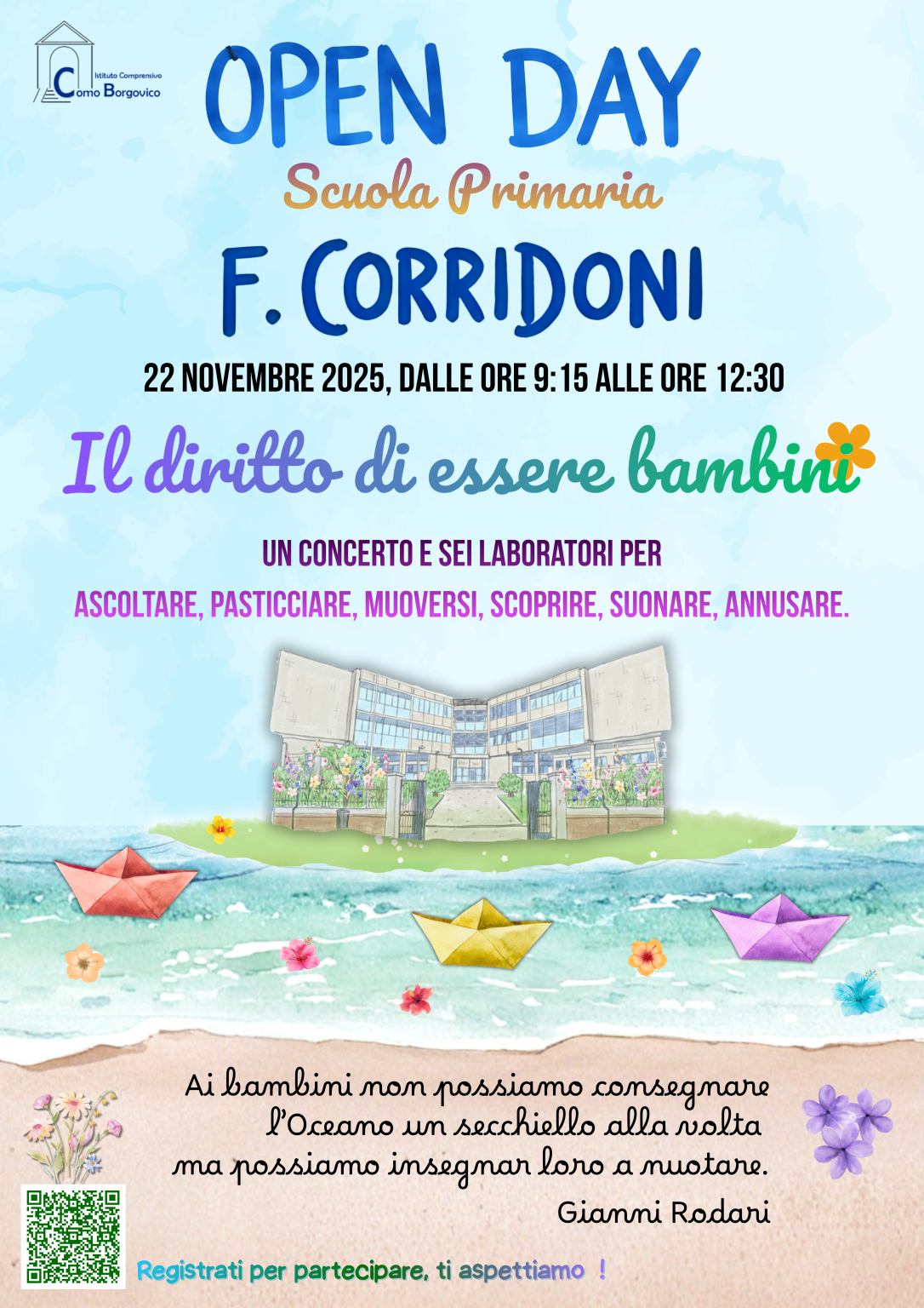 L’appuntamento per genitori e bambini è per l’Open Day della scuola del 22 novembre, per “toccare con mano, finalmente con più serenità, quanto la Corridoni sia viva”.