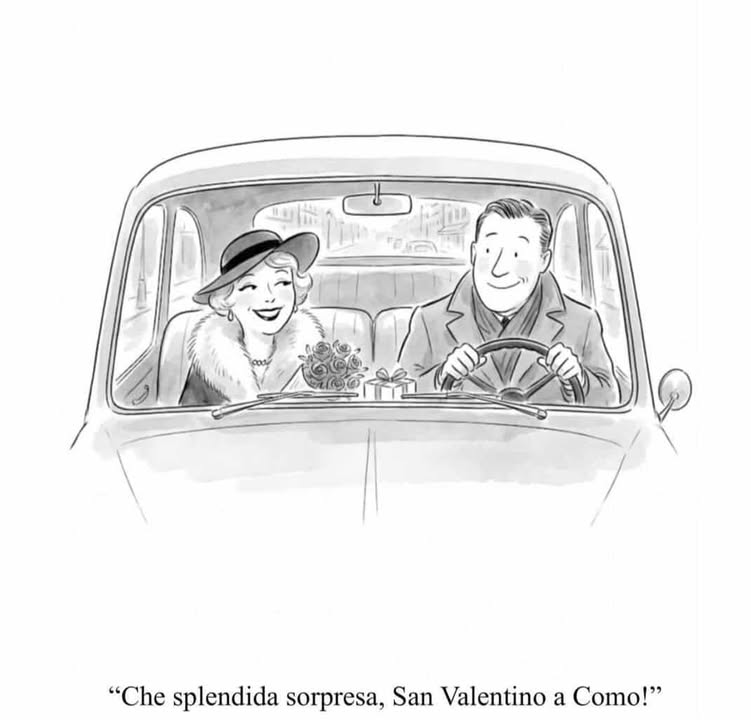 Nella vignetta si vede una distinta coppia a bordo di un’auto a Como, nel giorno di San Valentino: lei inizialmente sorridente con fiori e regali, lui che si allontana dal’auto giusto un attimo per pagare il parcheggio a Como. Al ritorno, però, l’amaro epilogo: lei mangia con sguardo intristito un semplice panino sul sedile, lui beve una bibita al volante. Come a dire, insomma, che tale è il costo della sosta a Como, che vanifica anche i sogni più romantici.