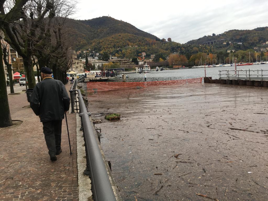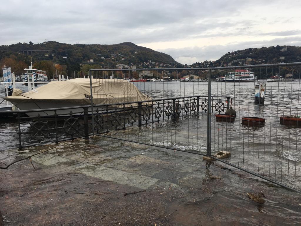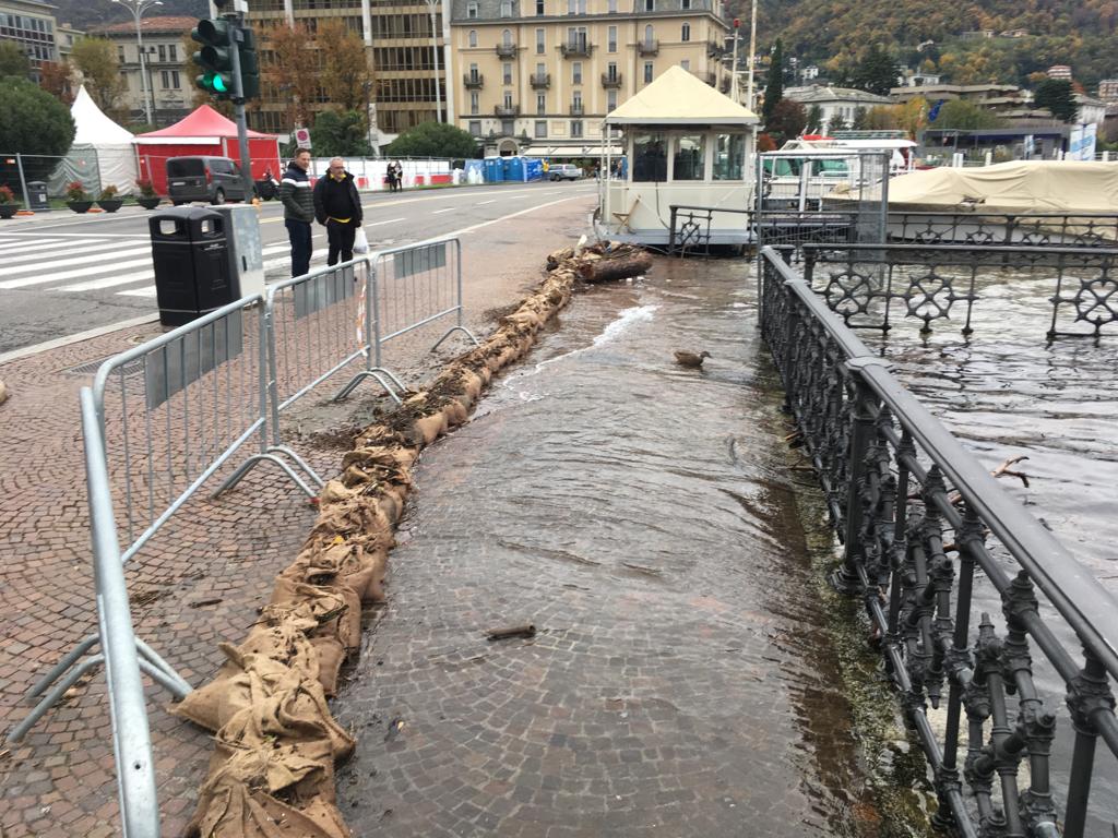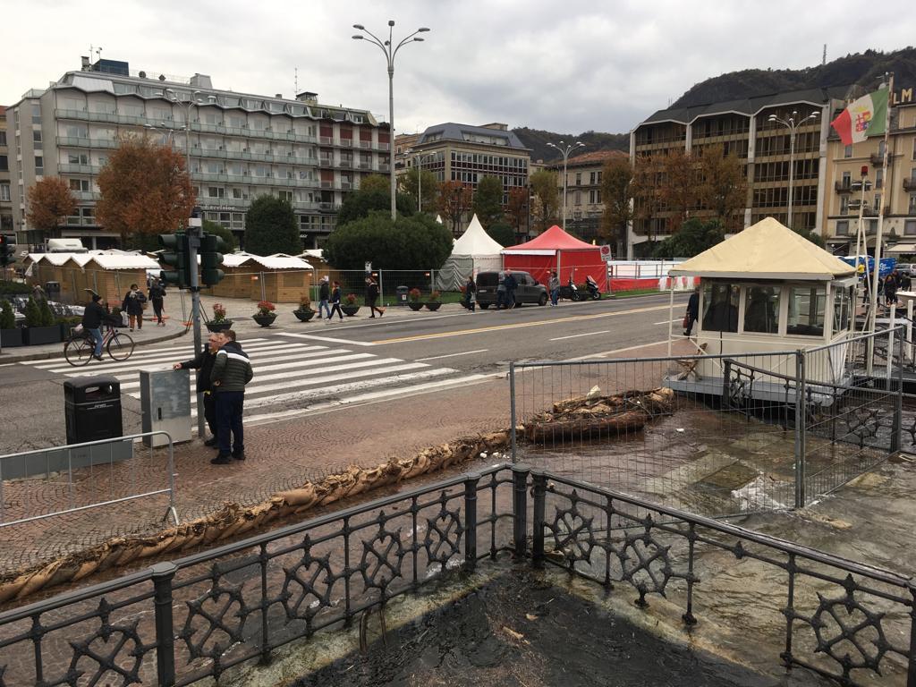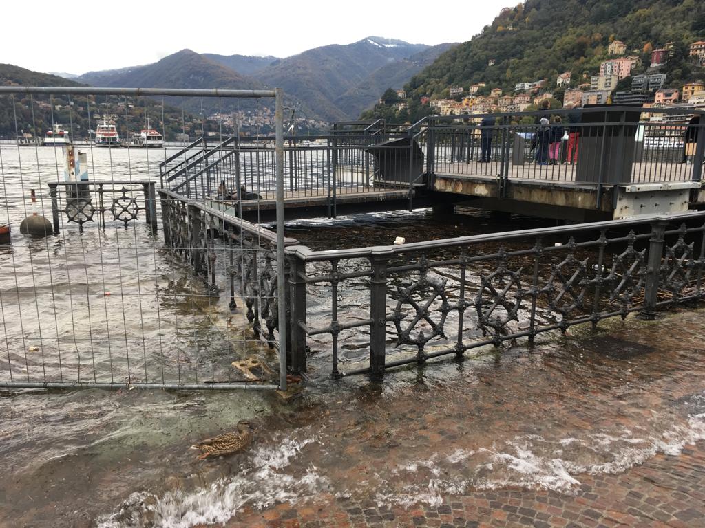 Le forti piogge degli scorsi giorni hanno portato all’innalzamento del livello del lago che, in piazza Cavour, sta lambendo il marciapiede esterno.