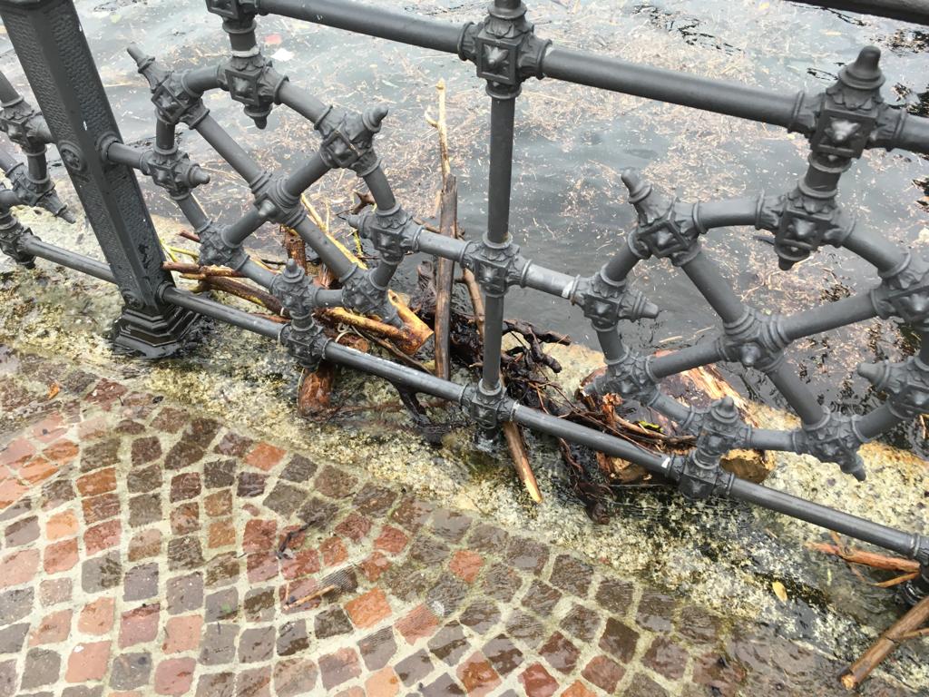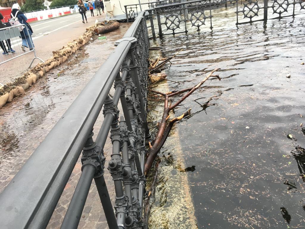 Come è possibile vedere dalle foto, scattate pochi minuti fa, sono stati posizionati dei sacchetti di sabbia per contenere l’acqua. Diversi i detriti portati a valle dalla pioggia, tra i quali spiccano tronchi e rami d’albero.