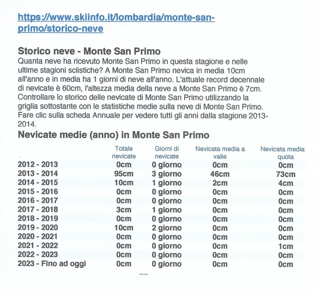 E anche i dati sulle nevicate indicano un innevamento minimo come mostrato dal Comitato che riporta lo storico neve