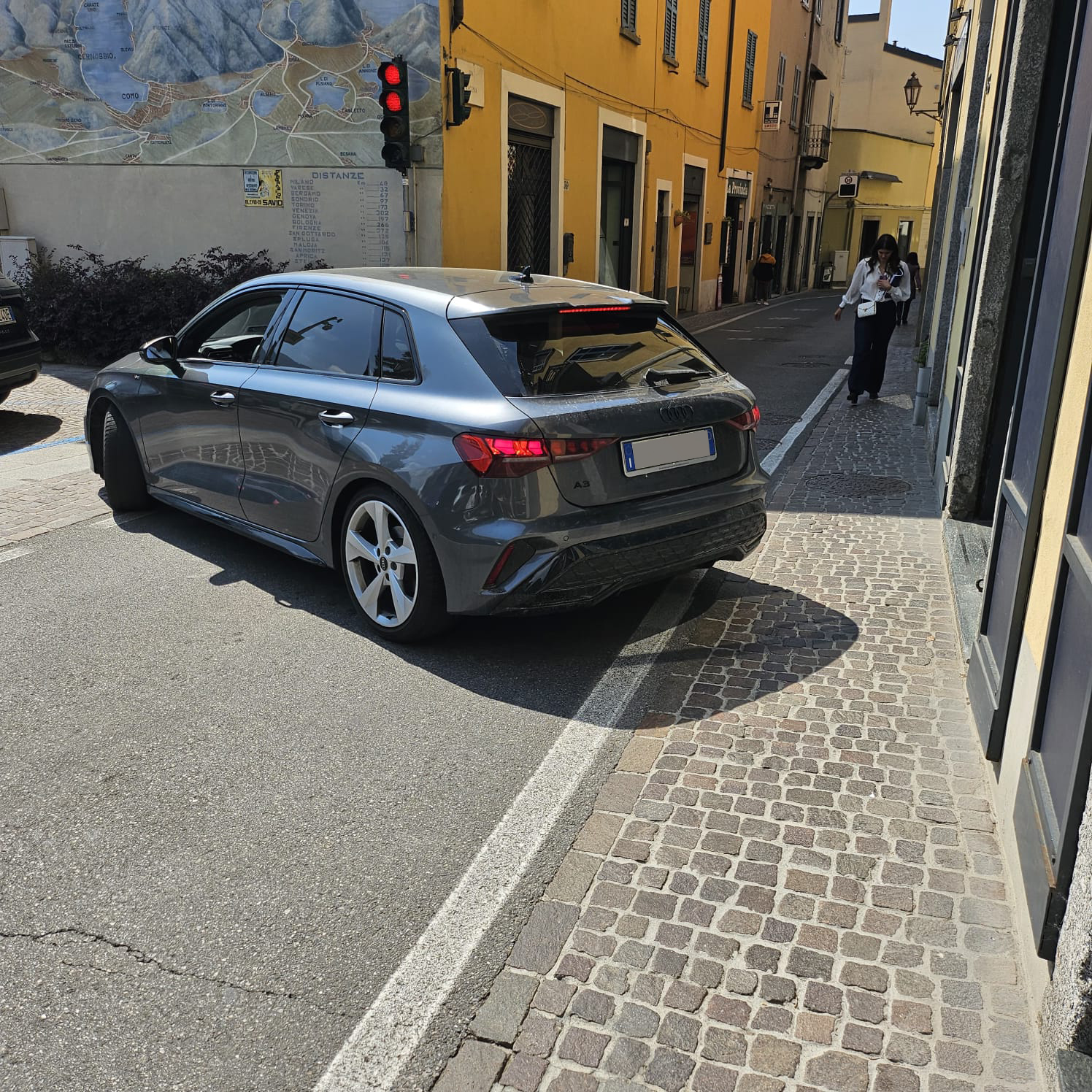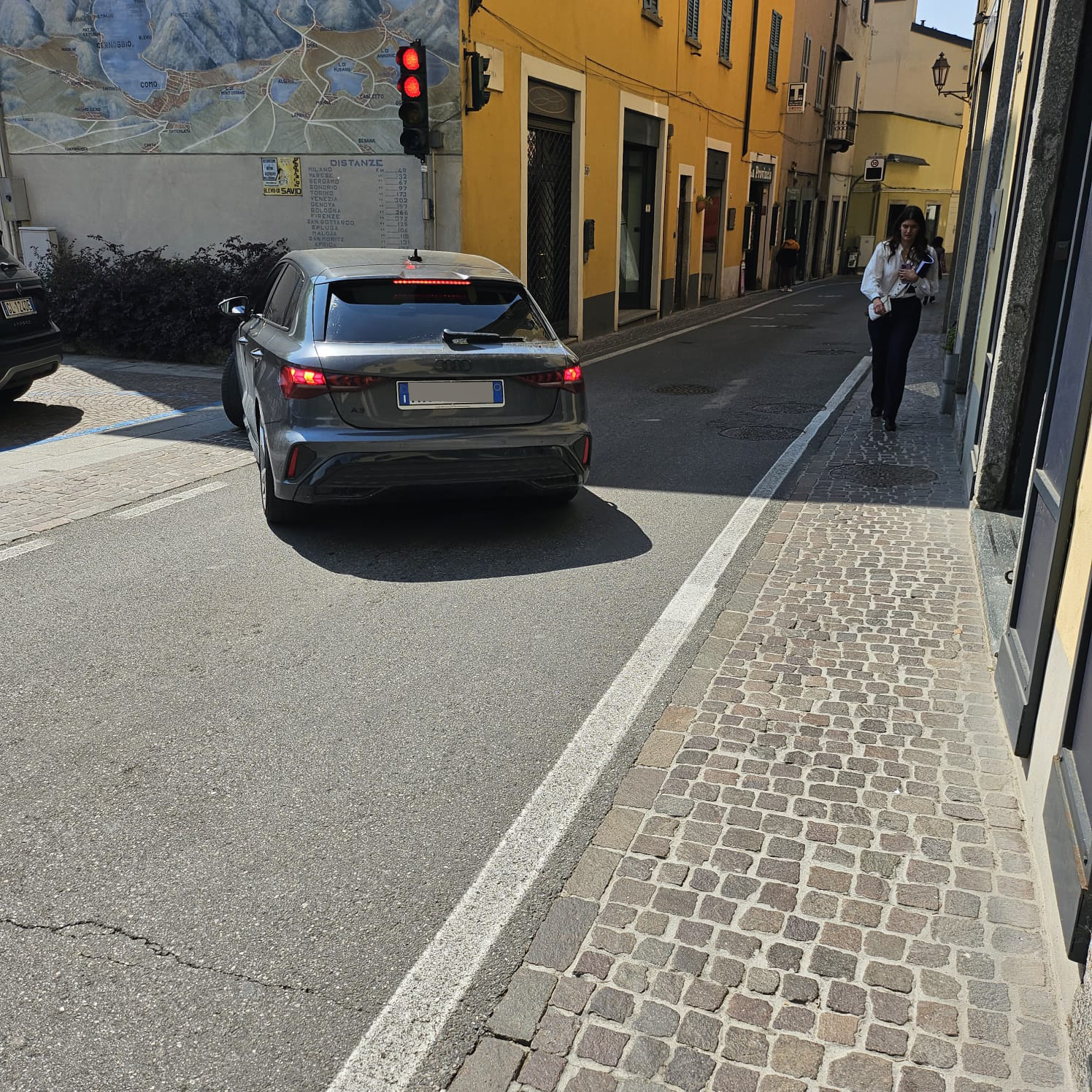 Fa manovra per uscire dal parcheggio con tanto di aiuto esterno della sciura che gli dava istruzioni ed era già rosso. Poi non curante ha fatto tutta la strettoia con semaforo già verde per chi arrivava dalla direzione opposta. I pedoni sulla strettoia ormai rischiano la vita. Non sono riuscita a fare video perché ero al telefono con una amica a cui ho descritto situazione surreale.