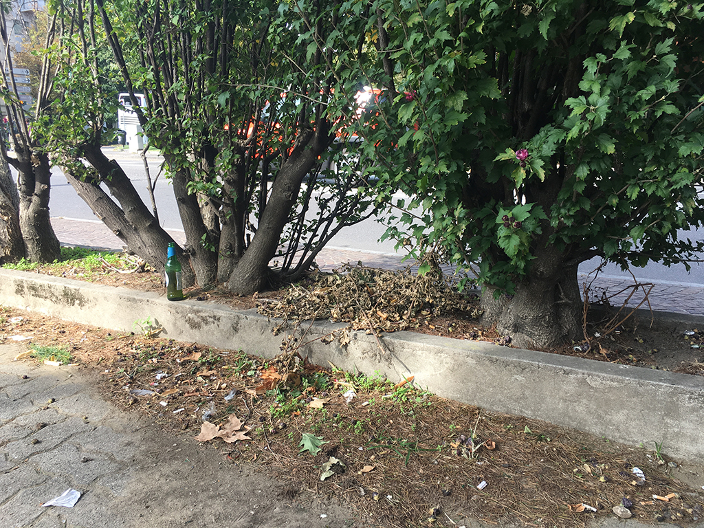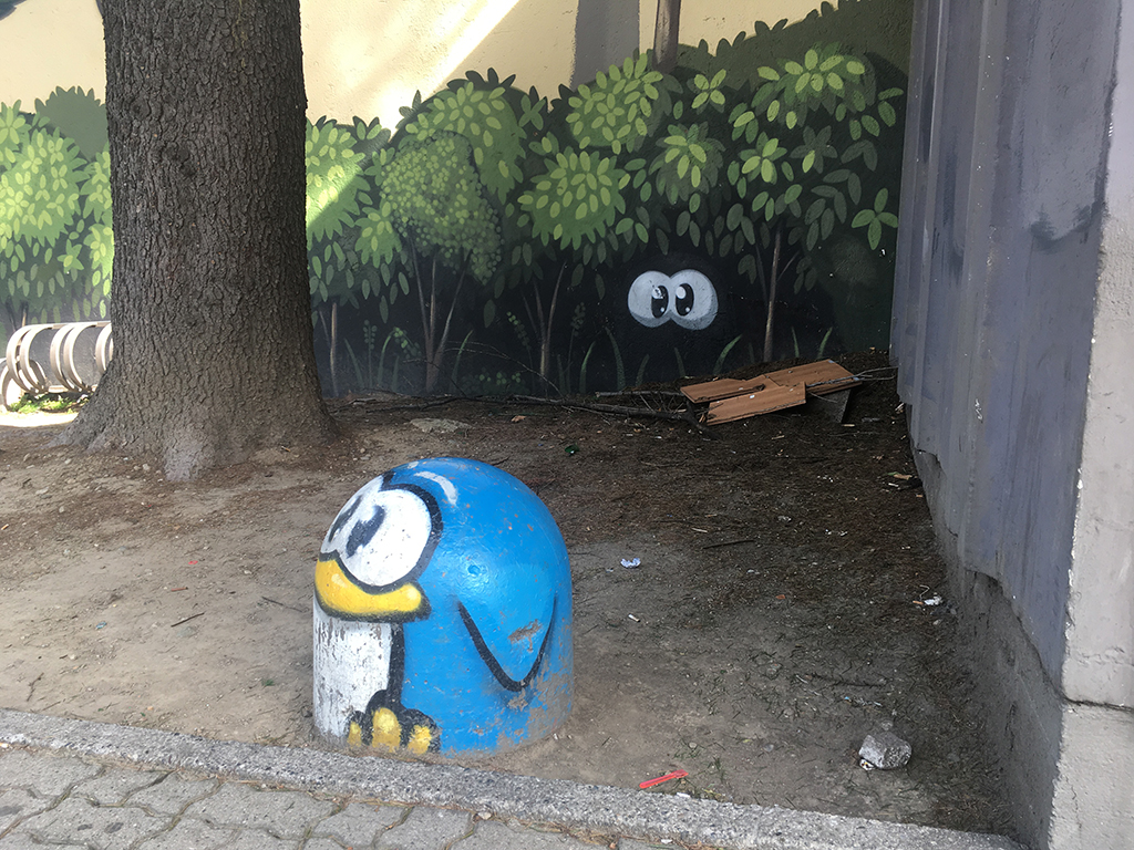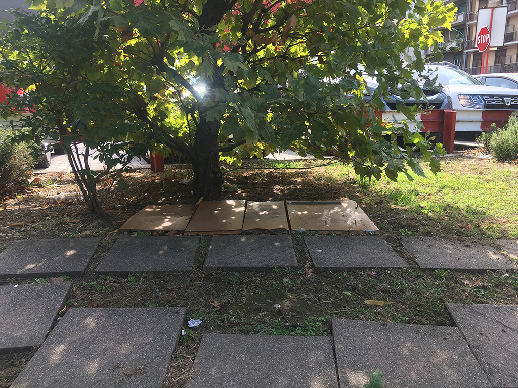 E in effetti biglietto da visita offerto dalle aiuole davanti all’ingresso non è dei migliori: resti di ante rotte(?) abbandonate sotto i cespugli, cartacce, bottiglie di birra vuote, tappi di bottiglia e un albero usato come wc (con i prevedibili effluvi) sotto gli occhi stupiti del murales e dei pinguini-paracarro realizzati un paio di anni fa dall’artista Pao per il vicino Ostello Bello. Una situazione che si ripete identica da moltissimo tempo.