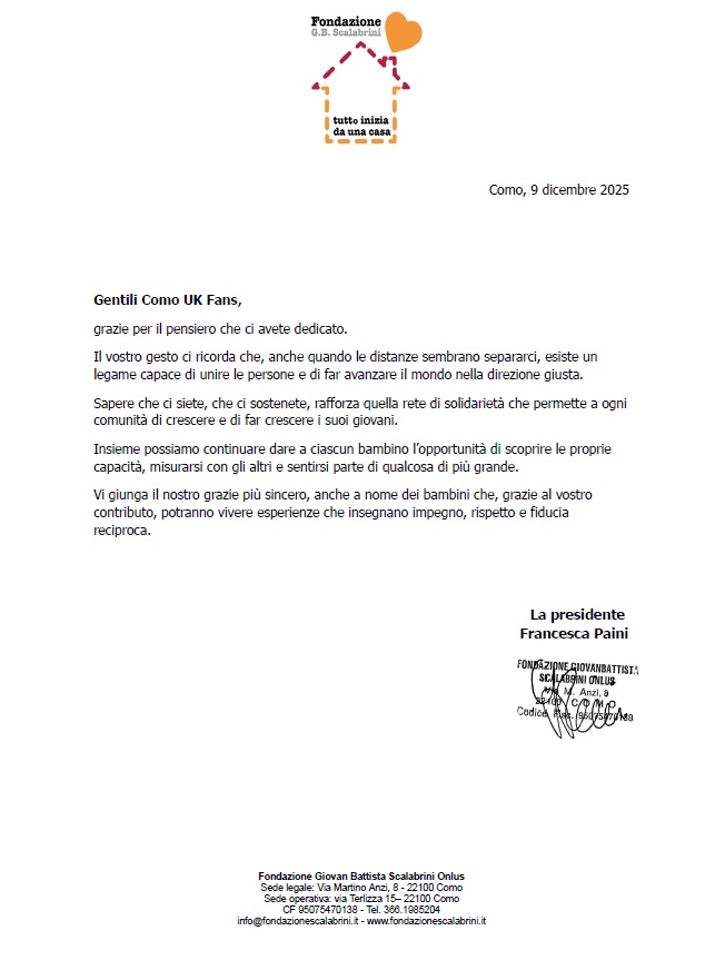 A volte il Natale arriva senza luci e senza pacchetti, ma con una storia che scalda i cuori. E’ quello che è successo in questi giorni grazie al Como 1907 UK Fans, il gruppo di tifosi inglesi del Como 1907 provenienti dal Derbyshire di cui avevamo raccontato la storia giusto due anni fa , che oggi ha saputo trasformare la propria passione in un gesto concreto, raccogliendo mille euro attraverso la vendita di sciarpe e magliette e scegliendo di donarli alla Fondazione Scalabrini di Como, perché quei soldi diventino sport, movimento, crescita e possibilità per bambini e ragazzi di famiglie in difficoltà. Un dono che non nasce per caso, ma è il naturale approdo di un legame costruito nel tempo, fatto di tifo, sì, ma soprattutto di accoglienza, amicizie e di quella sensazione rara di sentirsi a casa anche quando si viene da lontano.