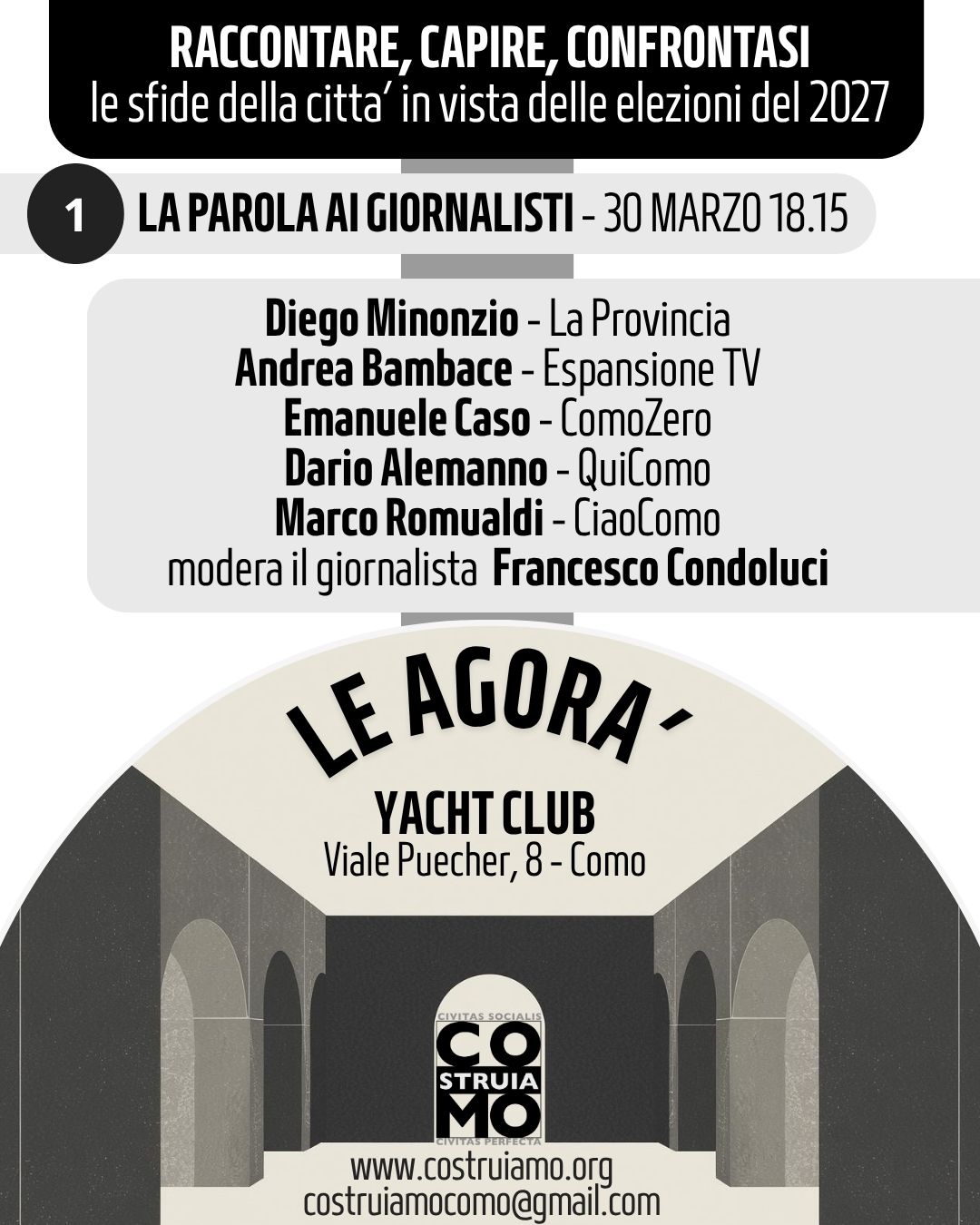 Il primo appuntamento, intitolato “La parola ai giornalisti – raccontare, capire e confrontarsi per la città”, si terrà lunedì 30 marzo 2026 alle ore 18.15 presso lo Yacht Club di Como. L’incontro inaugura il percorso delle Agorà di COstruiaMO, un ciclo di momenti di ascolto e dibattito che coinvolgerà nel tempo diverse componenti della società comasca – professioni, categorie economiche, associazioni, mondo del lavoro e della cultura – con l’obiettivo di favorire un confronto pubblico sulle trasformazioni che interessano la città e sulle prospettive di sviluppo.