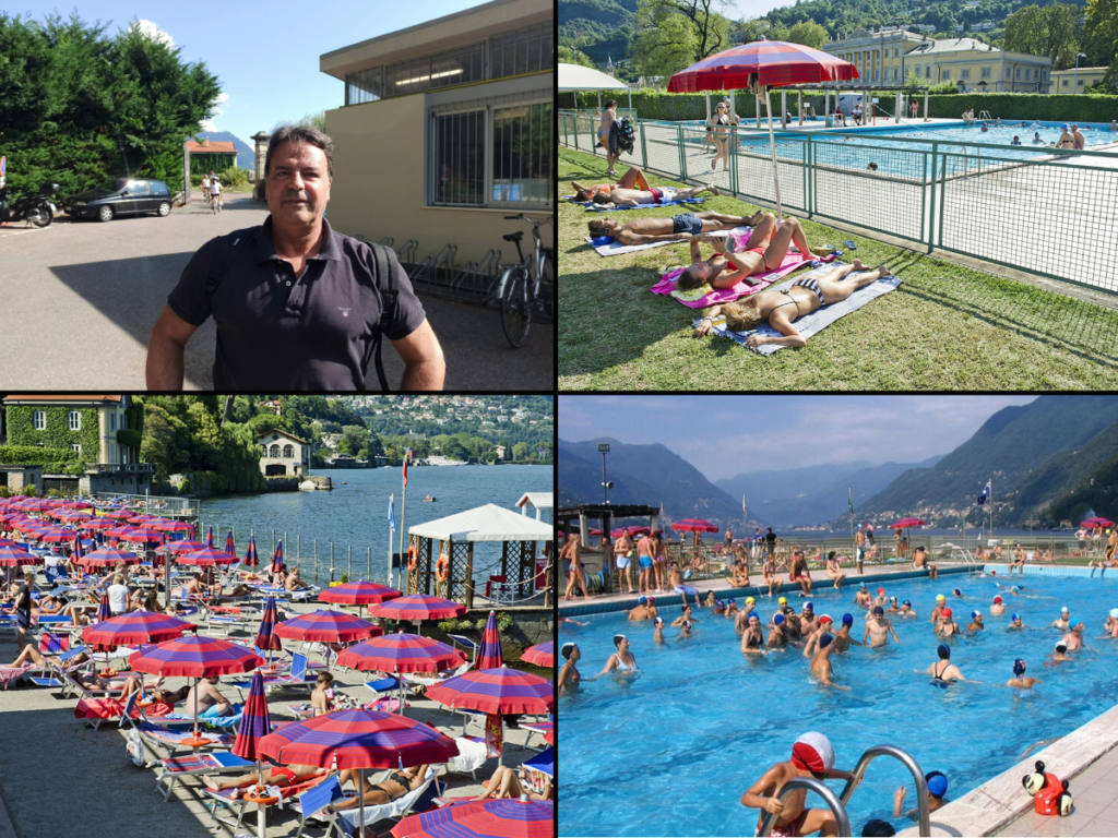 E poi la spiaggetta di sotto, quando non c’era ancora l’area vip e il bar era ricavato all’interno della struttura in cemento vicino a altalene e scivoli in ferro. Da molti anni il bar è passato al piano superiore davanti alle piscine, si è tanto ingrandito ed è accessibile anche dal parterre di Villa Olmo. Ma nella sostanza tutto è rimasto uguale.